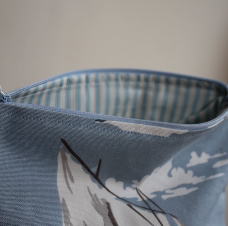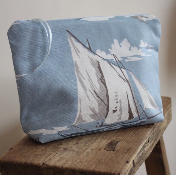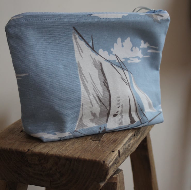 A simple, large, zip up pouch made from a fabric remnant featuring a sailing boat design. It is lined with blue and cream ticking stripe cotton and has 'boxed' seams.
