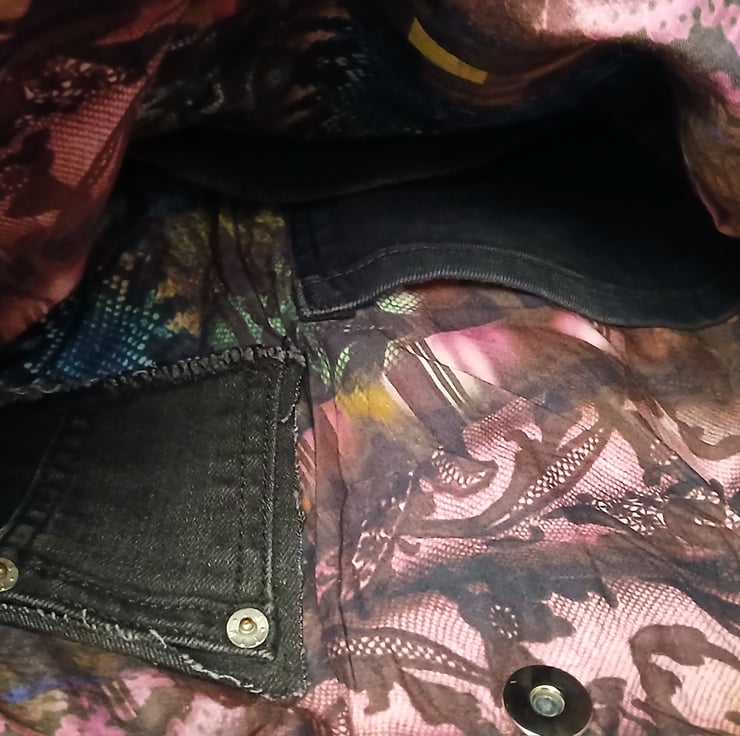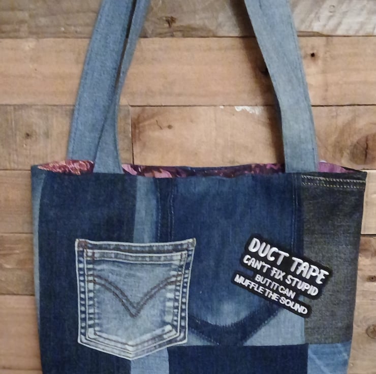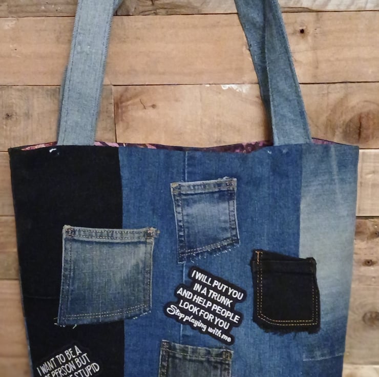 This upcycled denim tote bag has 11 pockets, each one a nod to your witty, sarcastic genius.