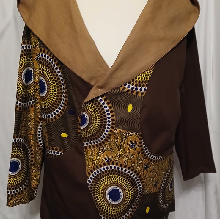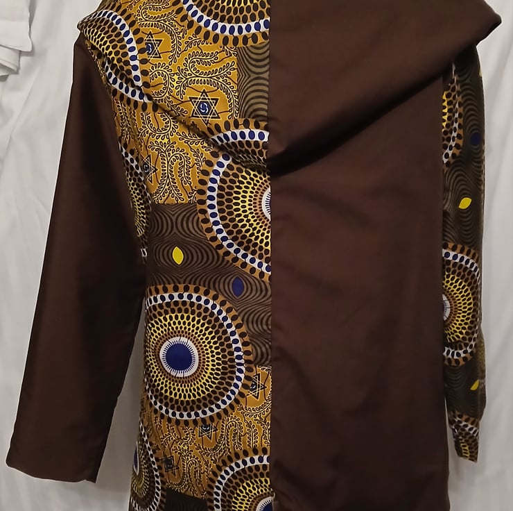 One side is a rich dark brown adorned with vibrant African print patterns in shades of brown, yellow, and blue, creating a striking contrast.