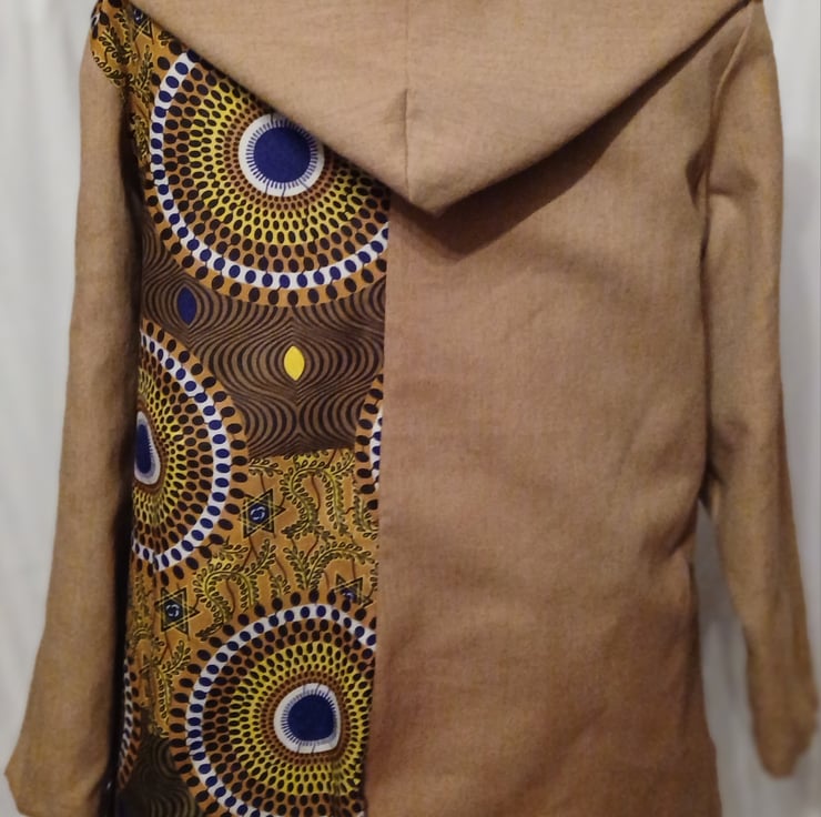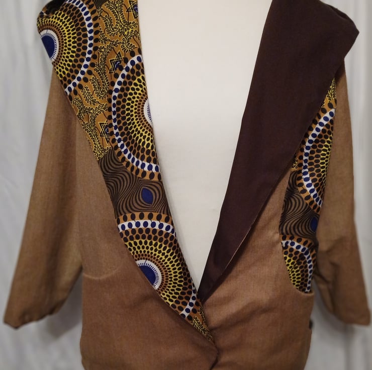 The other side is a lighter brown, also with the same African wax fabric print in coordinating browns, yellows, and blues, offering a more subdued but equally fashionable look.