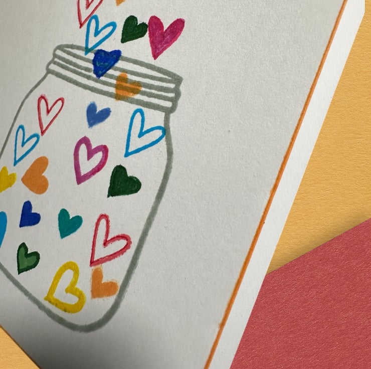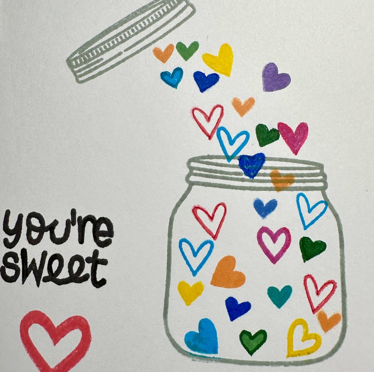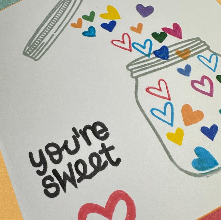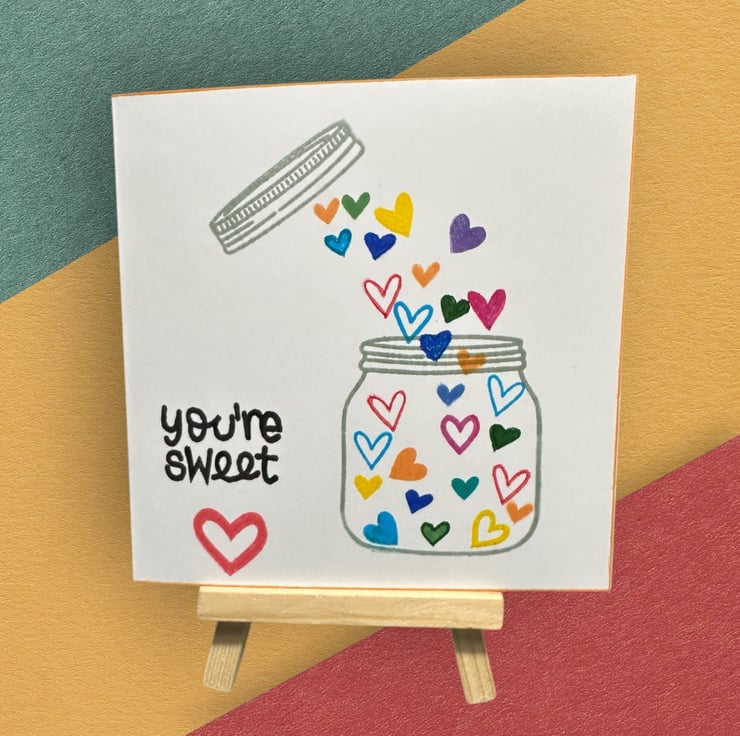 A bright and colourful contemporary card with individually hand printed heart shaped and rainbow coloured sweeties falling into a jar with the text “You’re Sweet” and a thin orange border around the card.