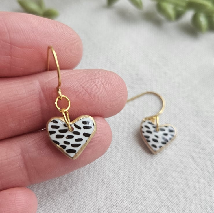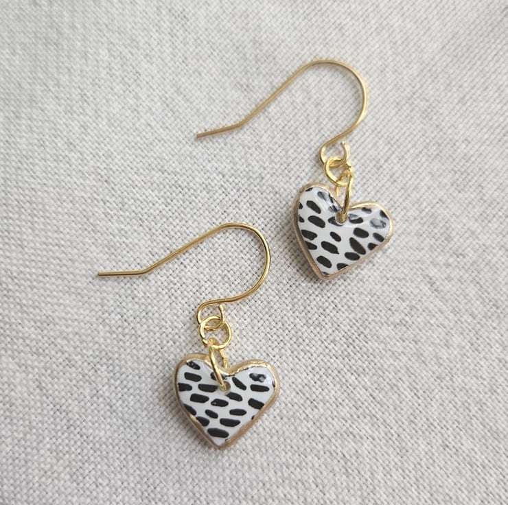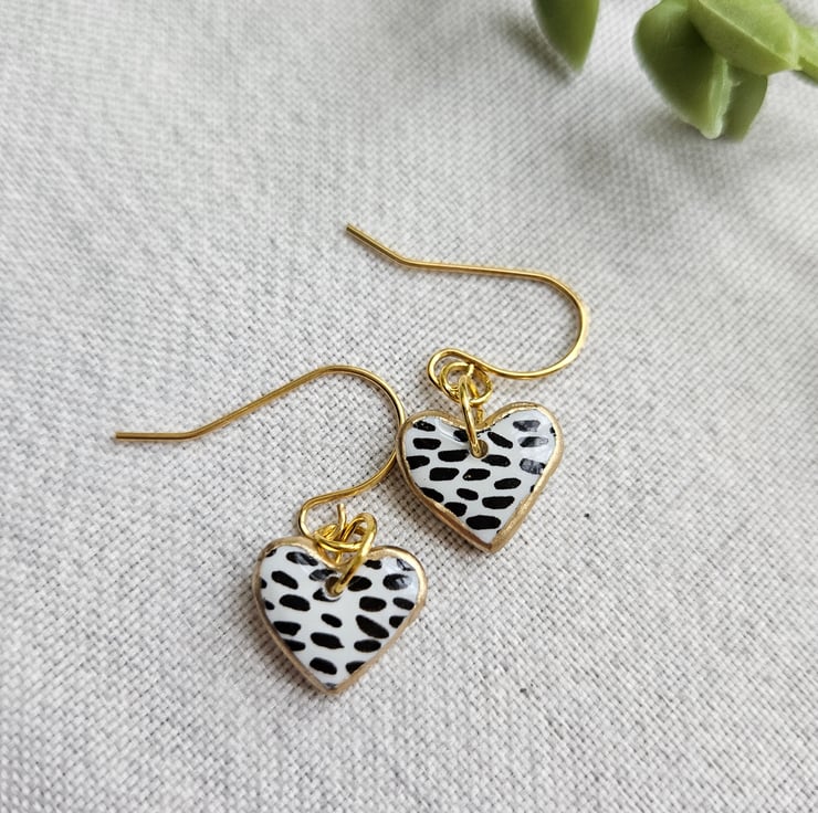 These super cute black and white heart earrings feature a gold edging detail and are mounted on a gold plated stainless steel hook.