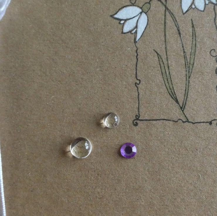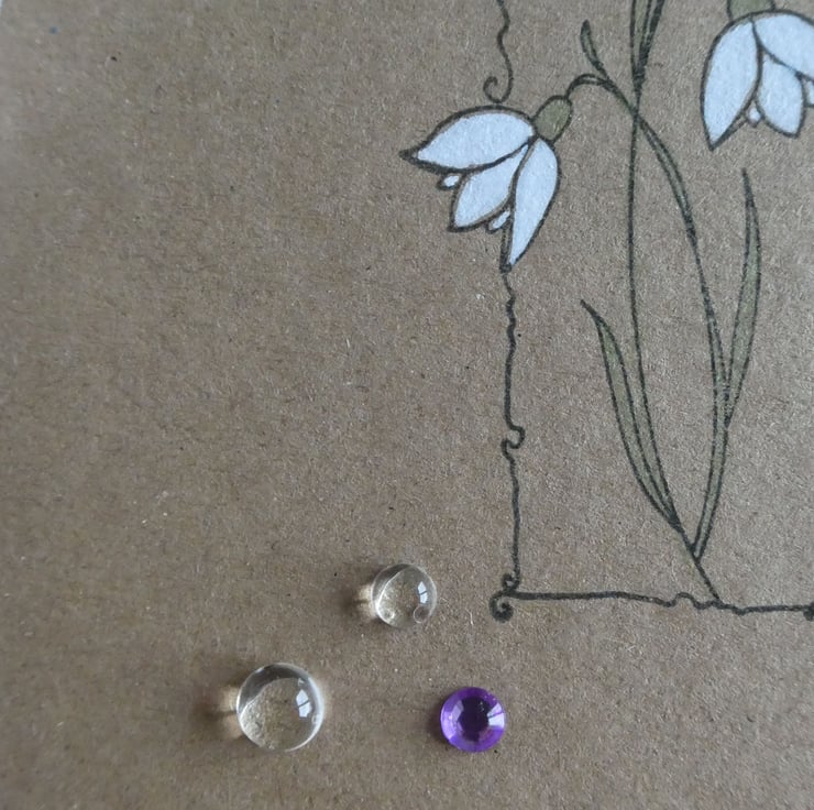 Two clear cabochon and one lilac faceted faux gemstones and the greeting Happy Birthday have been added to complete the design which has been mounted onto a white card base.