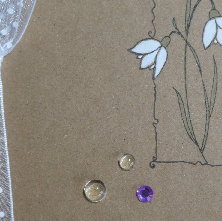 An image of two snowdrops in a scrolled frame has been hand stamped and coloured with a mixture of ink and paint. A band of white polka dot organza ribbon has been wrapped around the left hand side and finished with a knot.
