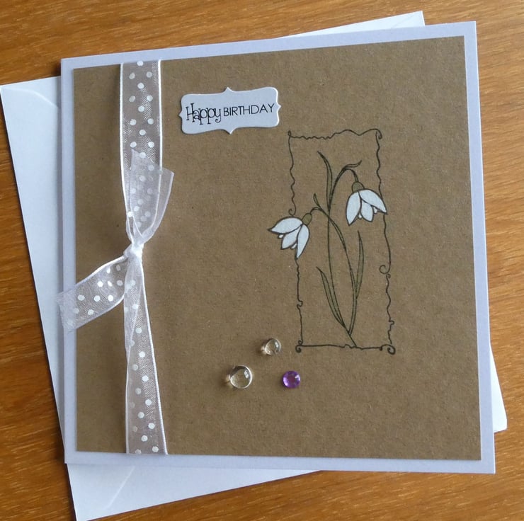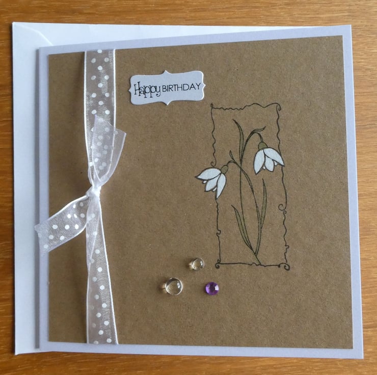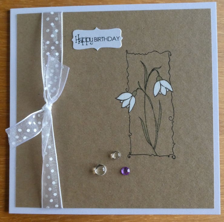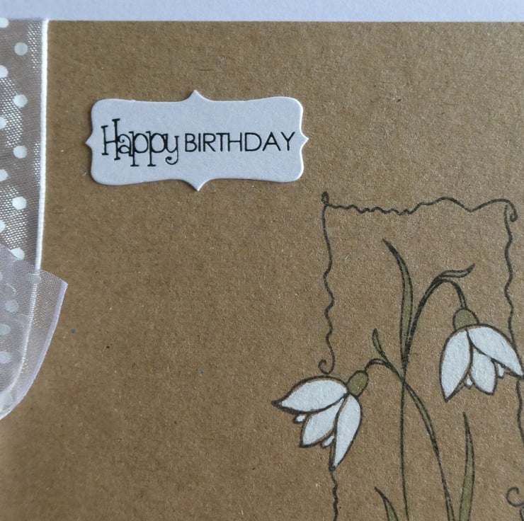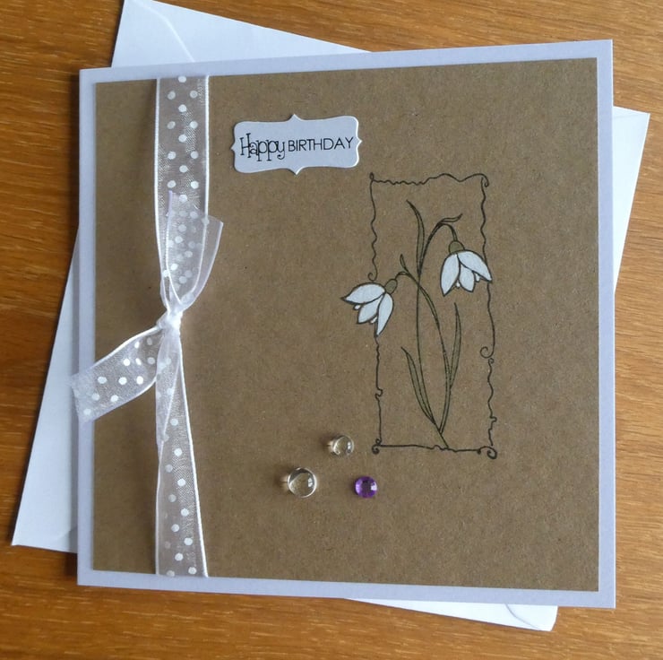 This birthday card has an image of delicate snowdrops hand stamped and coloured on a base of recycled kraft card making it ideal for a January or spring birthday.