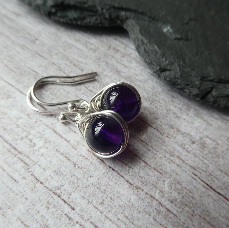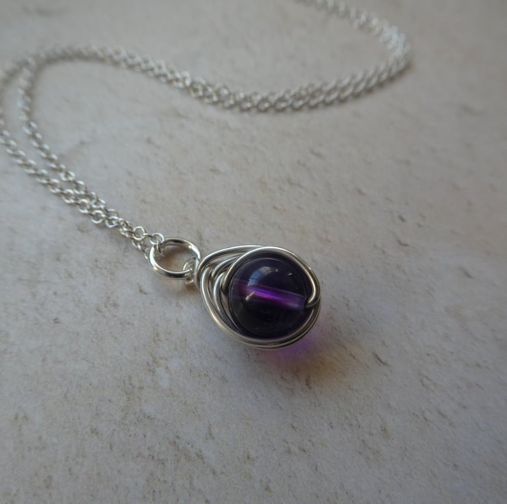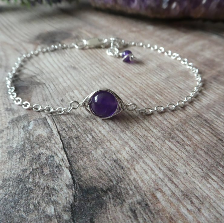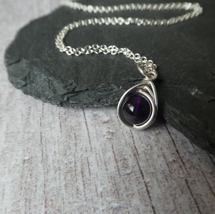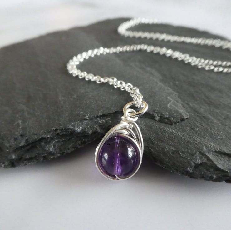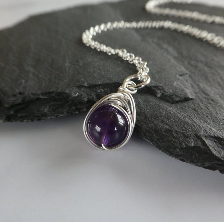 This dainty little pendant features a beautiful 8 mm amethyst bead. I have hand wrapped the bead in sterling silver wire which creates a knot work to frame the stone. It is finishes with an 18 inch sterling silver trace chain, ready to wear or gift. Matching items are also available to purchase separately.