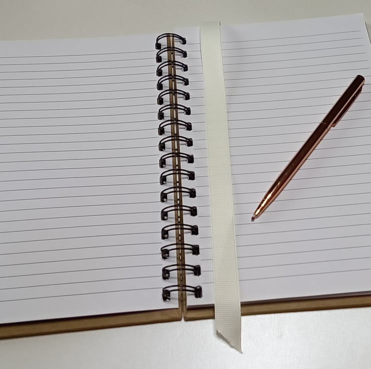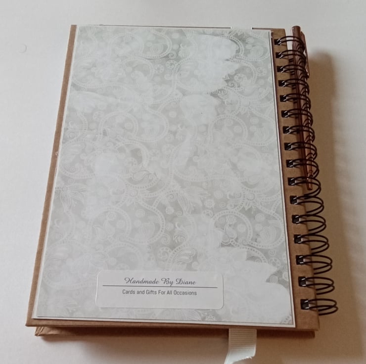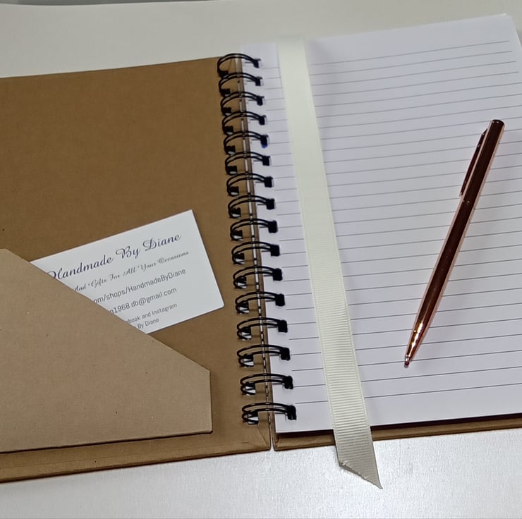 The base notebook has a sturdy Kraft card cover and is spiral bound making it easy to lie flat when open. I have decorated the front and back covers with patterned paper and on the front an image of shelves filled with yarn, embroidery etc. I have added a useful pocket inside the front cover for receipts, notes or business cards and a ribbon bookmark. The notebook comes with a ballpoint pen.