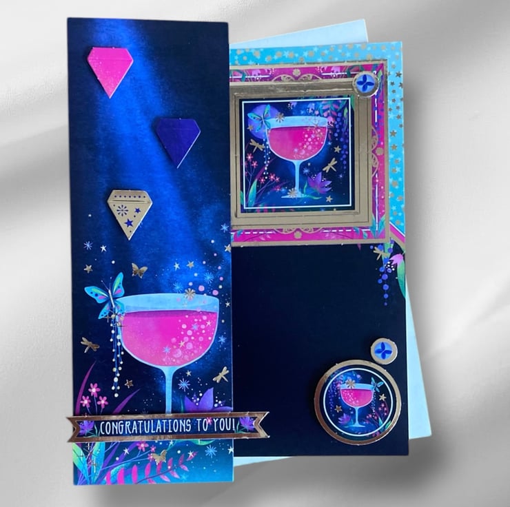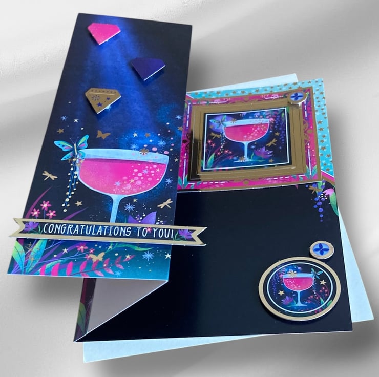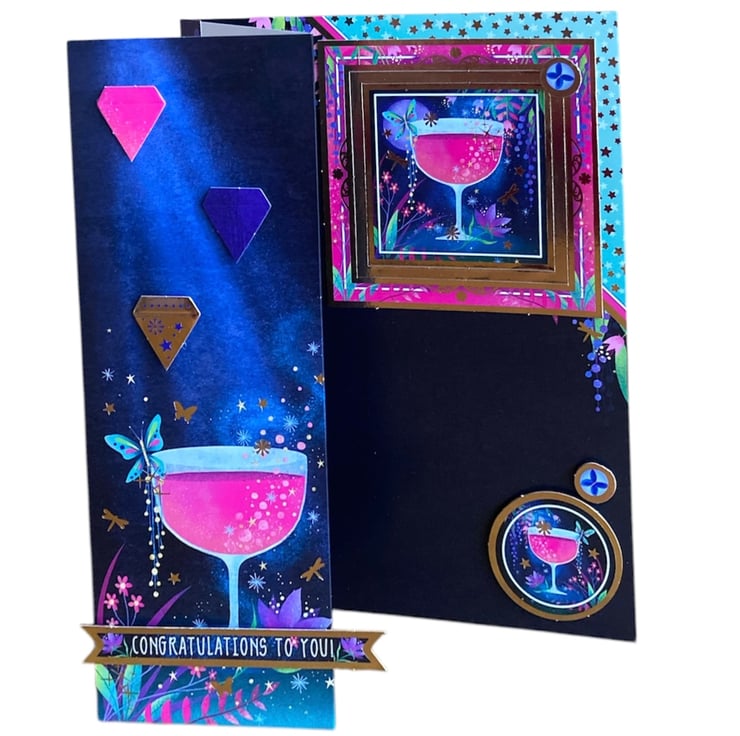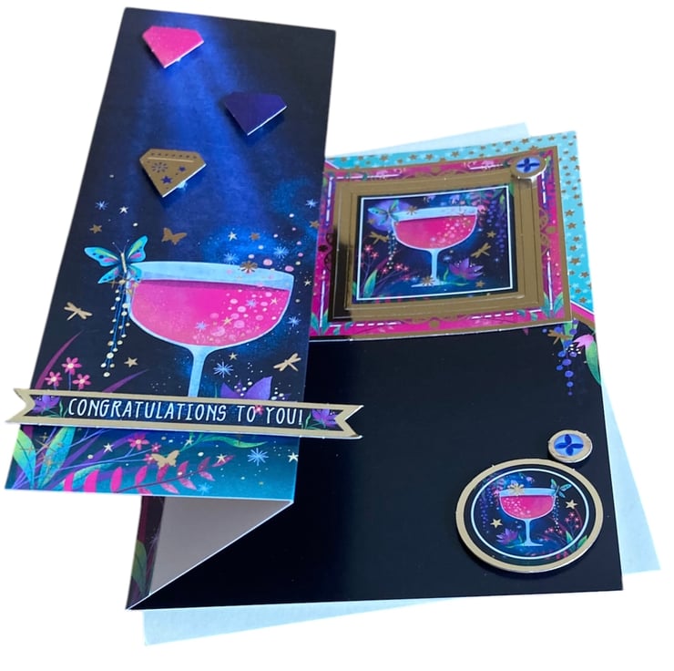 The zig-zag card in dark blue highlighted with bright green and pink flowers and butterflies features a glass full of pink Champagne. The words Congratulations To you, die cut diamonds and other embellishments have been added in 3D.