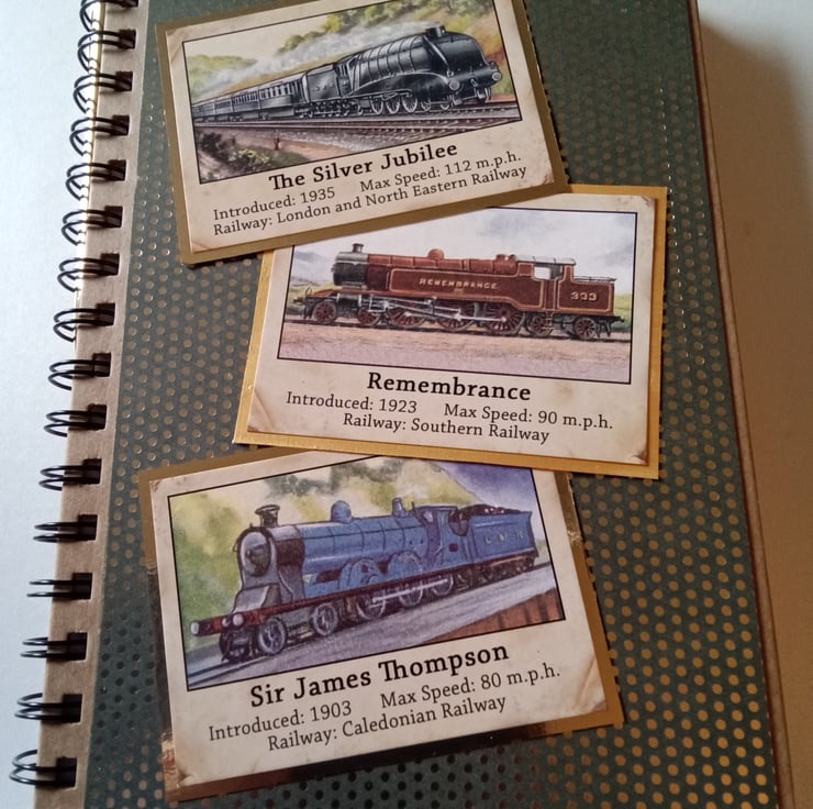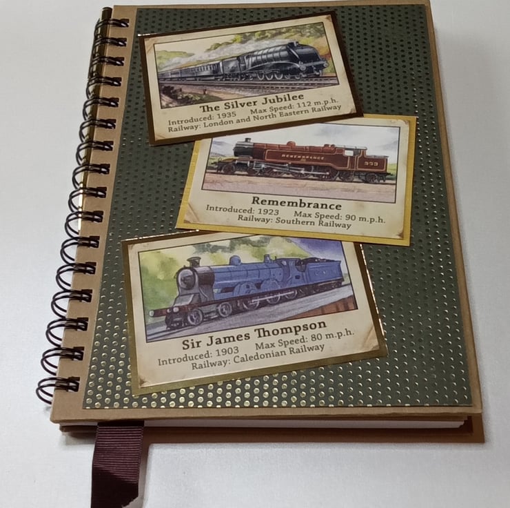 I have decorated the covers with card that is dark green with gold foiled polka dots and on the front with 3 cards featuring different steam trains. I've added a pocket inside the front cover that could hold notes, receipts or business cards and also a rosgrain ribbon bookmark to keep your page.