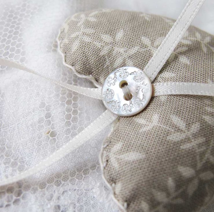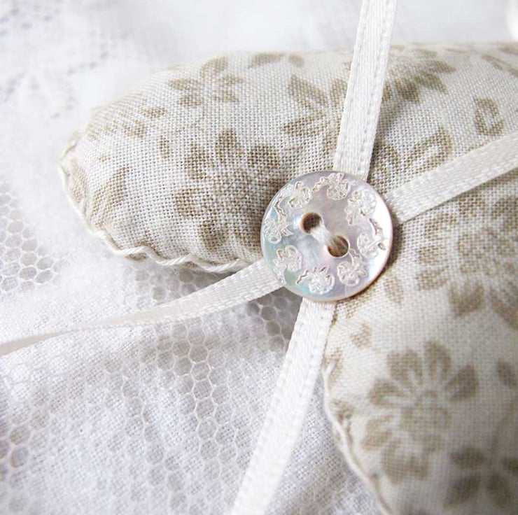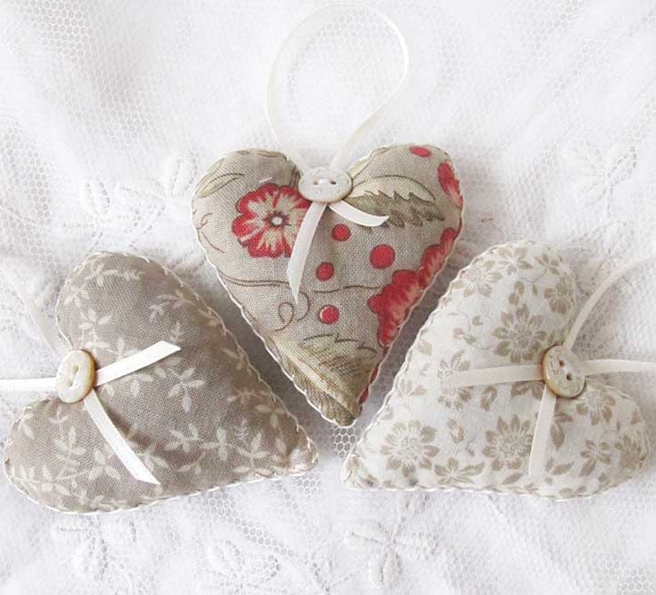 A very pretty little set of three lavender bags - hand made, filled with beautiful scented lavender and then finished with hand embroidery, satin ribbon and gorgeous little engraved buttons. They are in co-ordinating fabrics of beige, cream and red, wiith cream embroidery and ribbon. The hearts measure 6cm wide x 6.5cm long, not including the ribbon.
