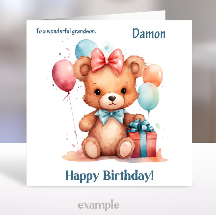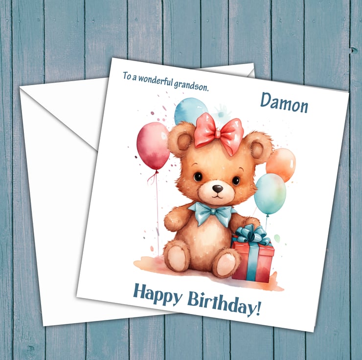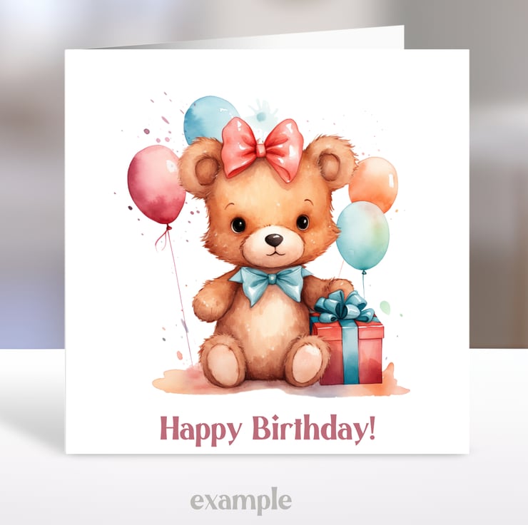 A 5.5 inch square card featuring a cute teddy bear with birthday present and balloons.