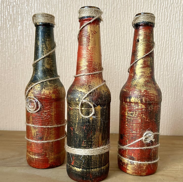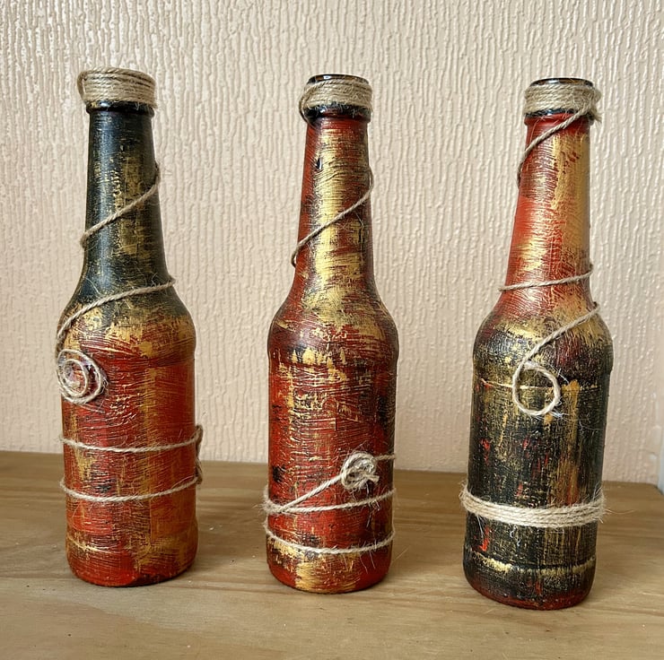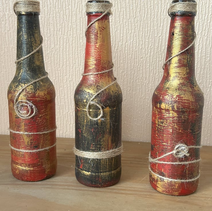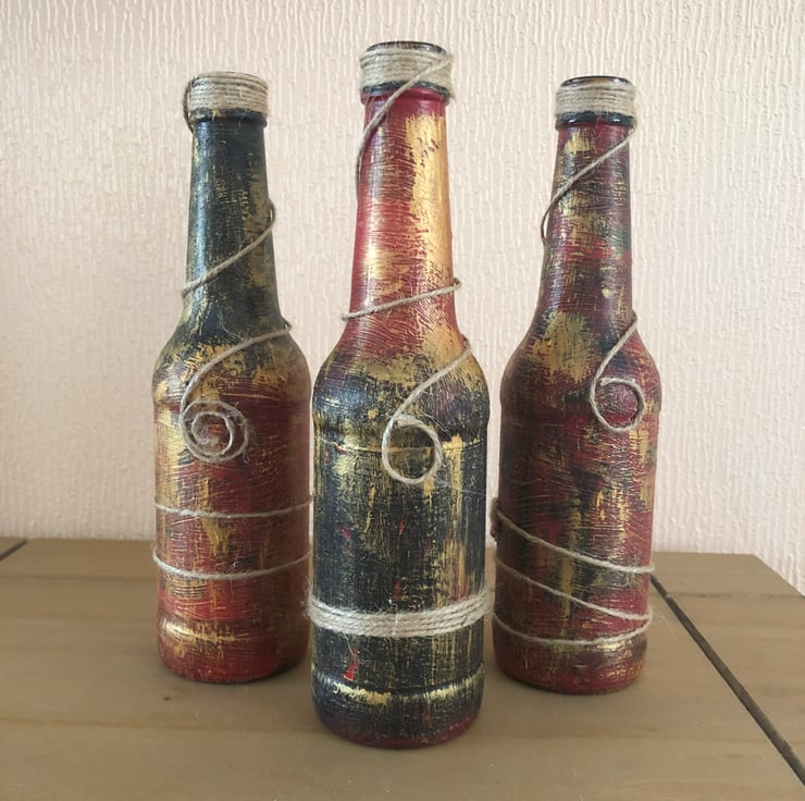 Set of 3 decorative bottles, painted with shades of red and gold, can be used as single stem vases, look very effective on a mantle, shelf or window sill, could even be used as candle holders for unique table decoration. Further decoration has been added with natural jute sting which gives a rustic charm. I have added felt to the bottom of each bottle to help prevent scratches on polished surfaces. This set would make a lovely unique new home gift, or small wedding gift.