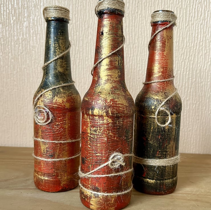 I like to recycle when I can and was looking to see what I could do with these beer bottles, so I started applying some paint and afterwards some natural jute string - turning these used beer bottles into interesting and unique pieces of home decor or interesting gifts