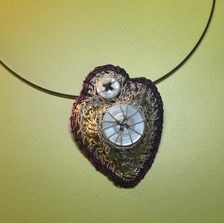 Heart pendant with repurposed vintage buttons and ribbon, incorporating braid from an Indian garment with copper wire and bought wire on a coated spun steel collar.