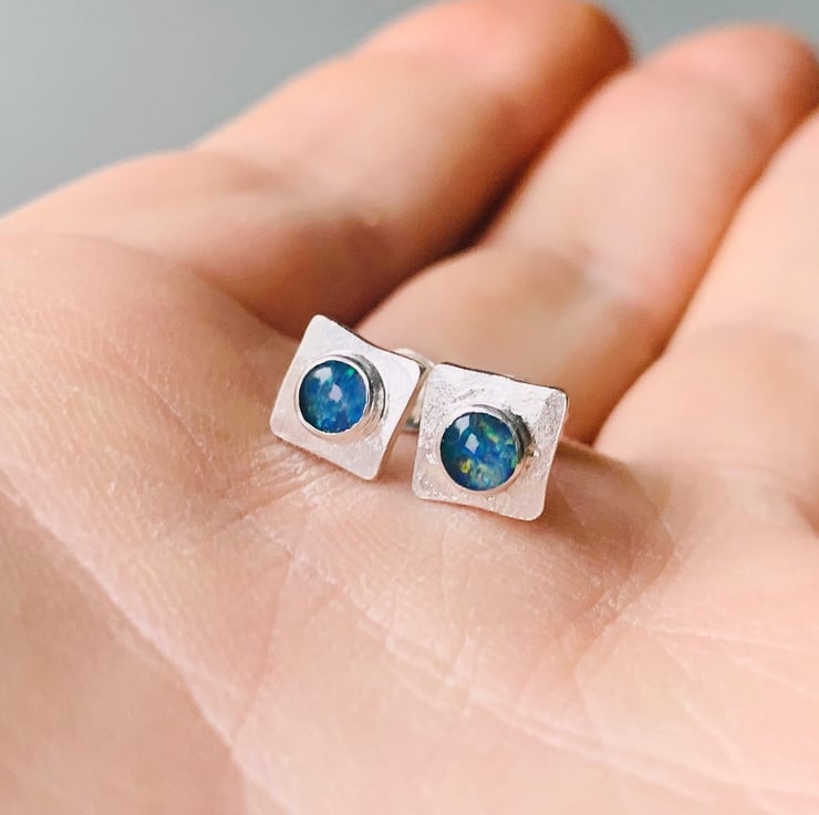 Little 6 mm Square studs with a 4 mm Opal Triplet Cabochon cut (Smooth domed top)