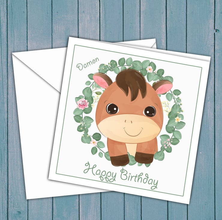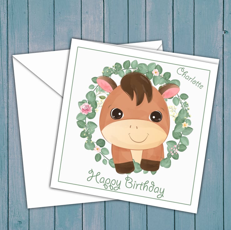 A 5.5 inch square card featuring a cute horse surrounded by a wreath of leaves and flowers and the words Happy Birthday.
