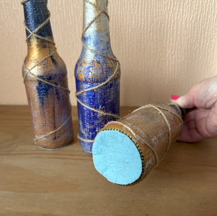 I used tones of blue, silver, gold and copper acrylic paint and then added natural jute string for more interest. These look great standing on a shelf, mantle or window sill, also can be used for flower vase look very stylish with a single stem flower. Candle holders for interesting table decoration. Ideal small wedding gift or New Home gift