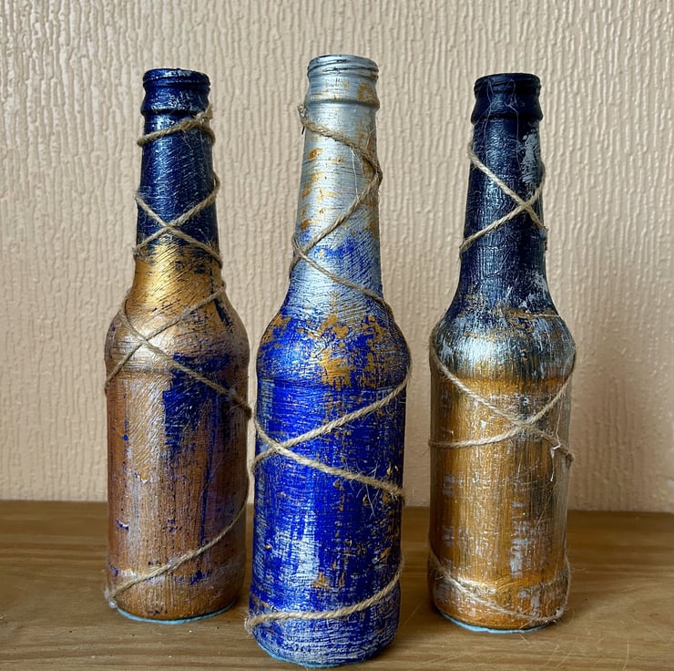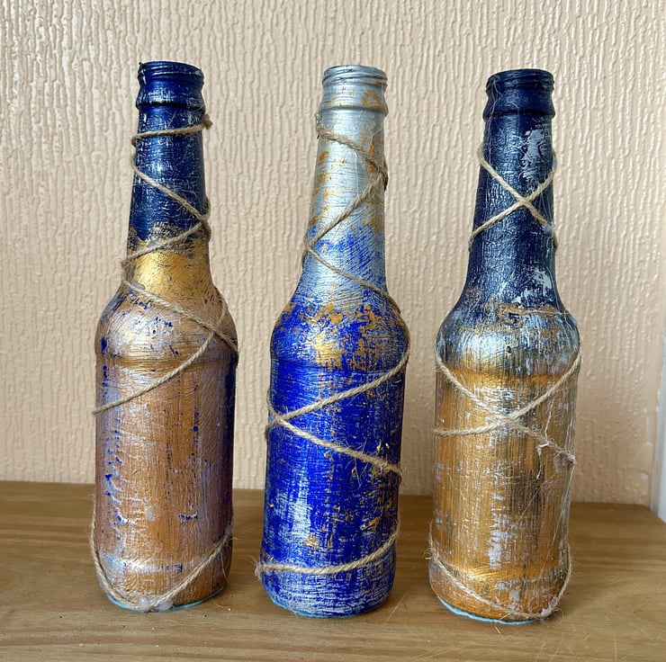 Charming set of 3 decorative bottles, created from painting recycled standard sized beer bottles