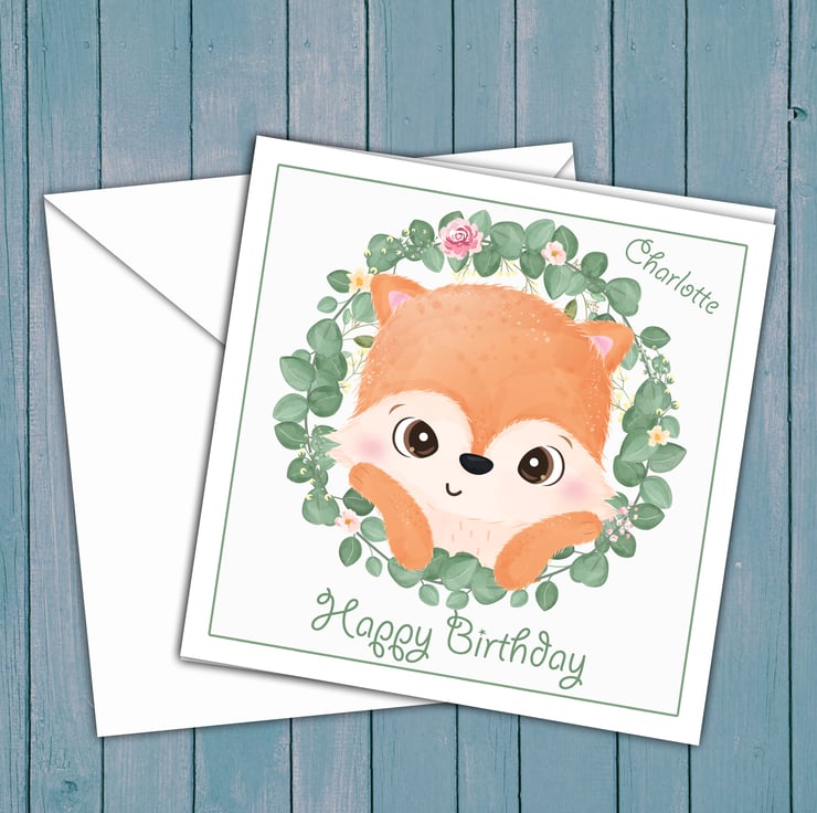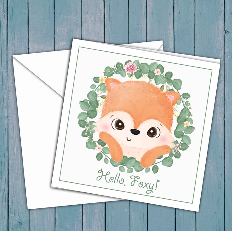 A 5.5 inch square card featuring a cute fox surrounded by a wreath of leaves and flowers.