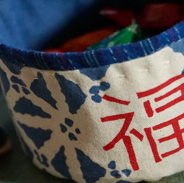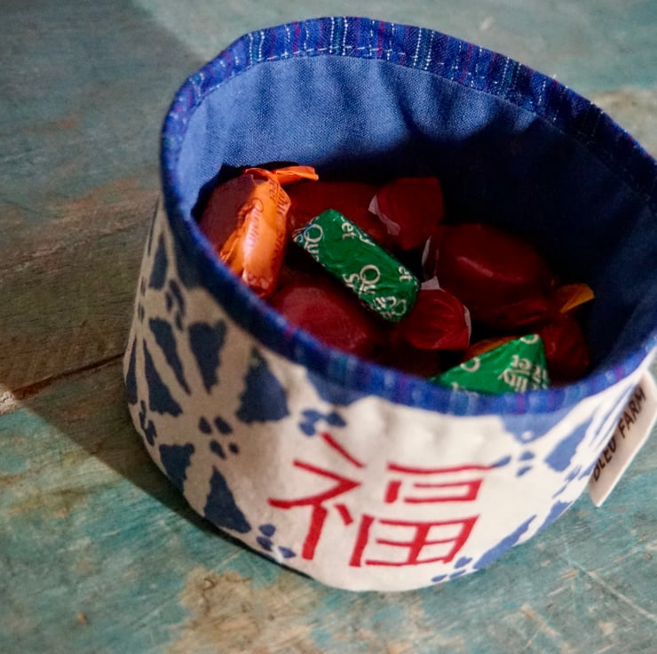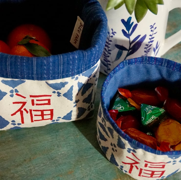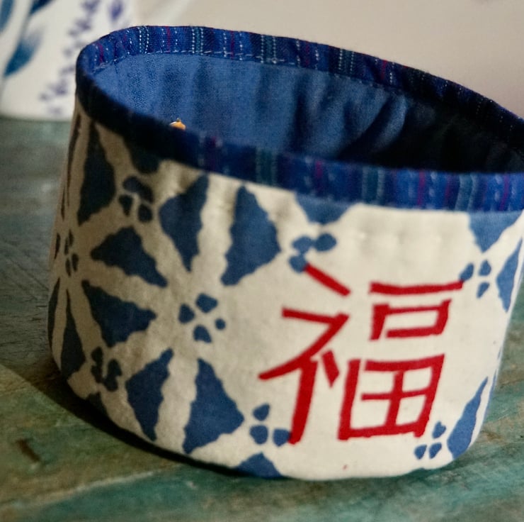 Keep your small essentials neatly tucked away in this round fabric storage basket, featuring the iconic "Good Fortune" motif. Ideal for sweets, sewing tools, or other small treasures, its compact design makes it a delightful addition to your home. Handmade using vintage inspired hand-printed cotton, it embodies simplicity, elegance and a wish for prosperity.