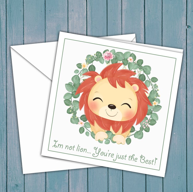 A 5.5 inch square card featuring a cute lion surrounded by leaves and flowers.
