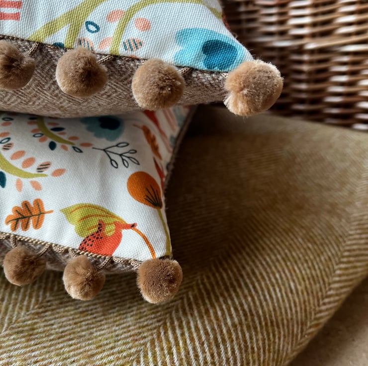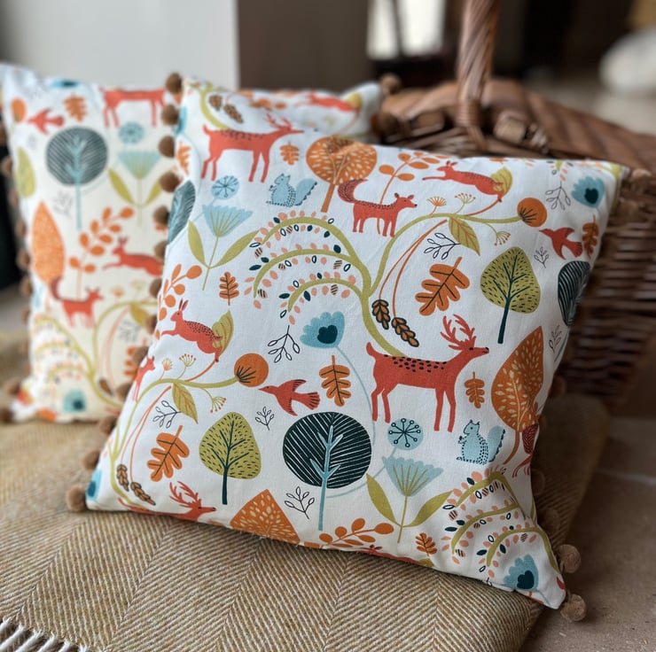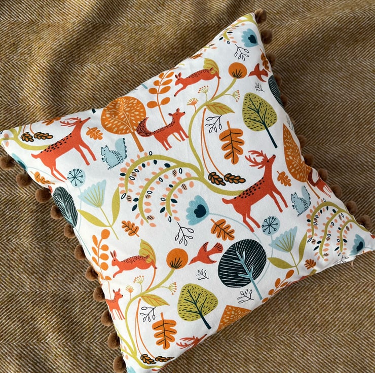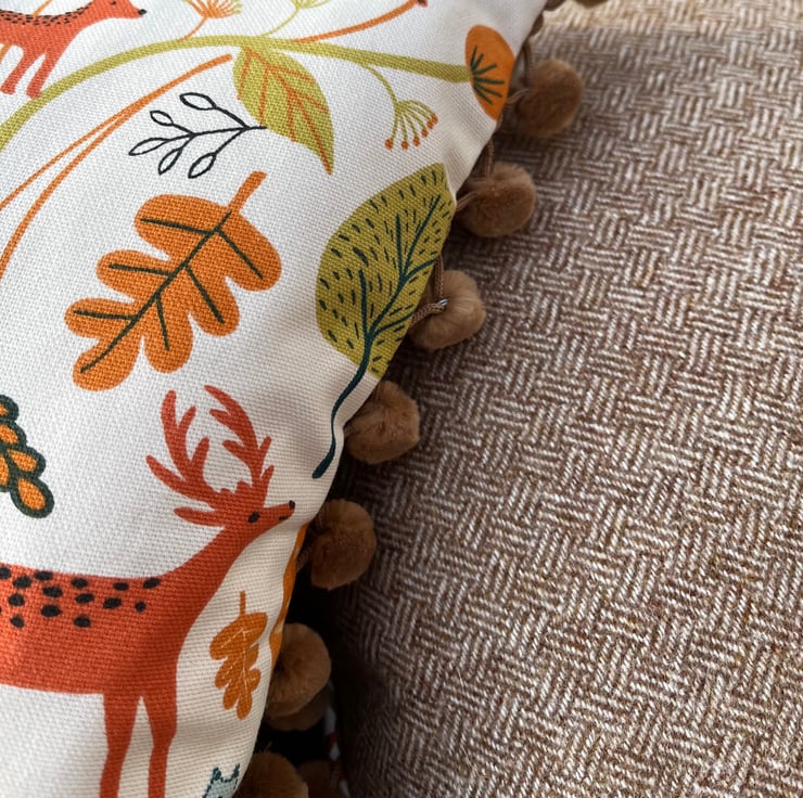 Forest print cushion cover with a fun pattern of deer, squirrels, rabbits, foxes, birds, trees and plants in orange, green and blue. The cushion is trimmed with velvety golden brown pompoms and backed with coordinating soft brown herringbone wool tweed.