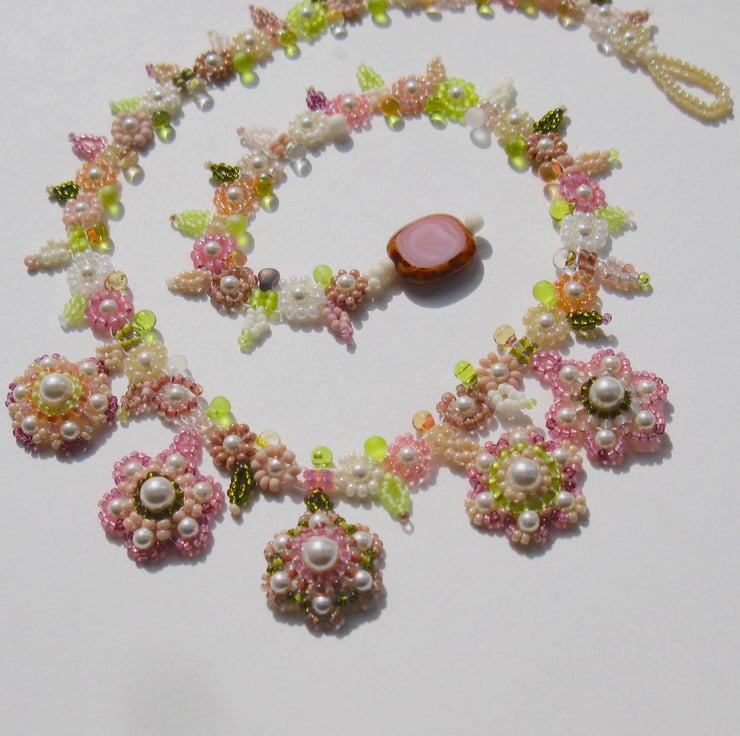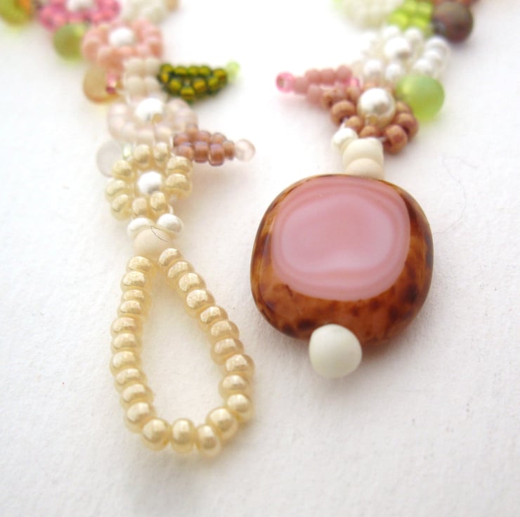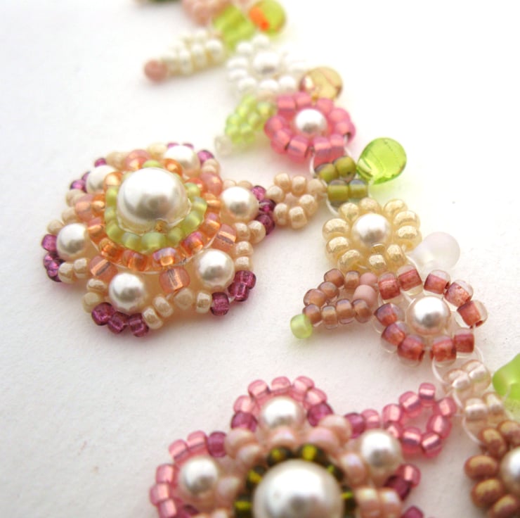 A beadwoven flowery necklace in delicate shades of pink, peach, cream and white with touches of lime green and lots of shiny white faux pearls. Hand stitched to my own design from glass seed and drop beads and fastened with a pink glass bead and a beaded loop. The necklace measures approx. 40cm long and has five flower pendants hanging from a 'daisy chain' of tiny beaded flowers and leaves. It's light and comfortable to wear and since it's entirely metal-free there is no worry about allergies.