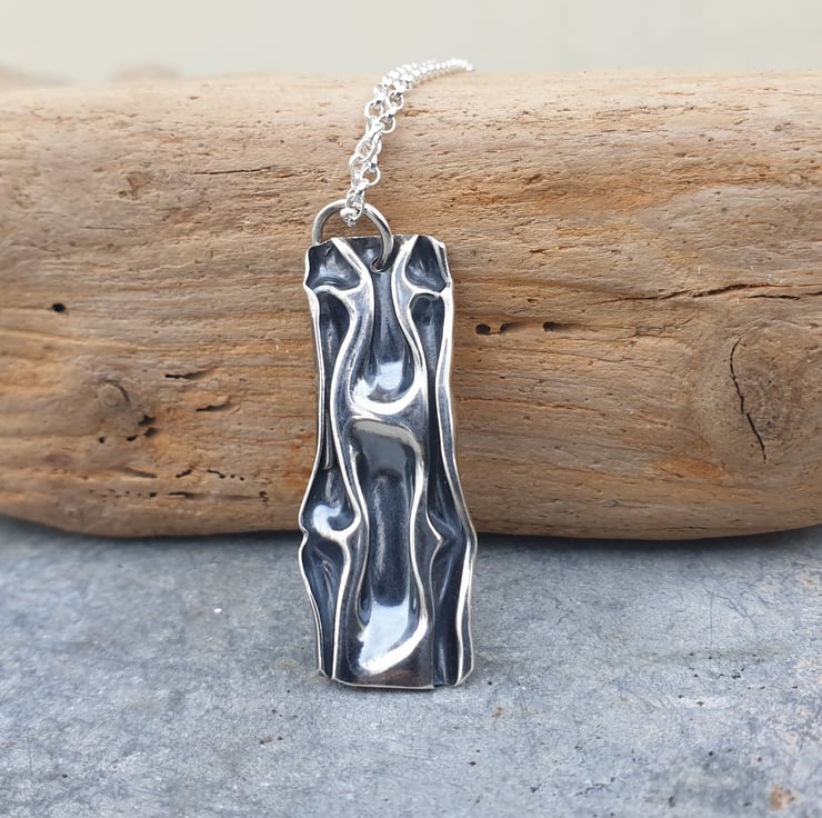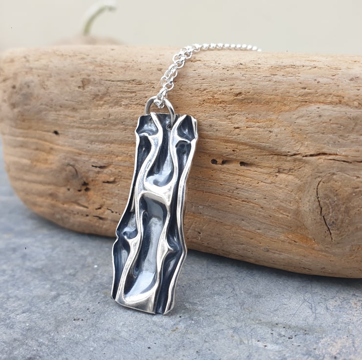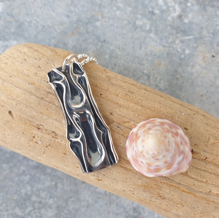 This one of a kind pendant is handmade from 0.3mm fine silver sheet that has been 'squashed' and folded to create the wavelike texture. It measures approx 37mm x 15mm and comes complete with a sterling silver belcher chain which fastens with a bolt clasp.