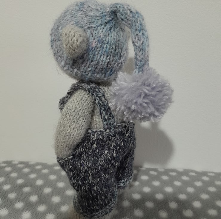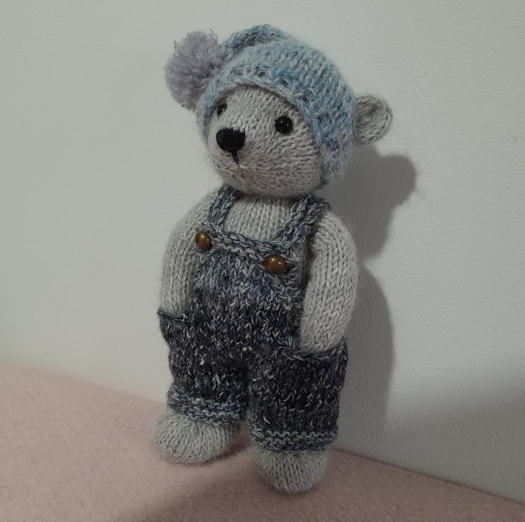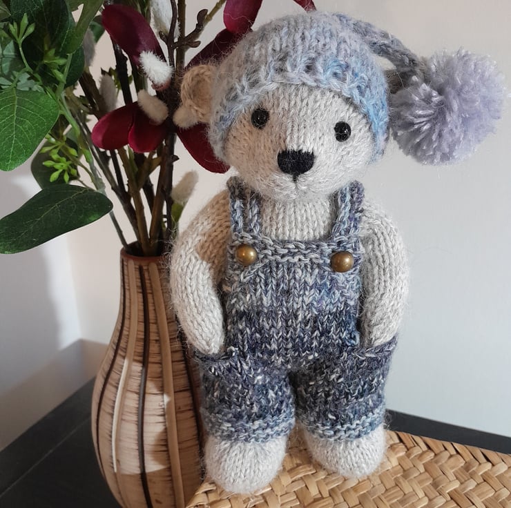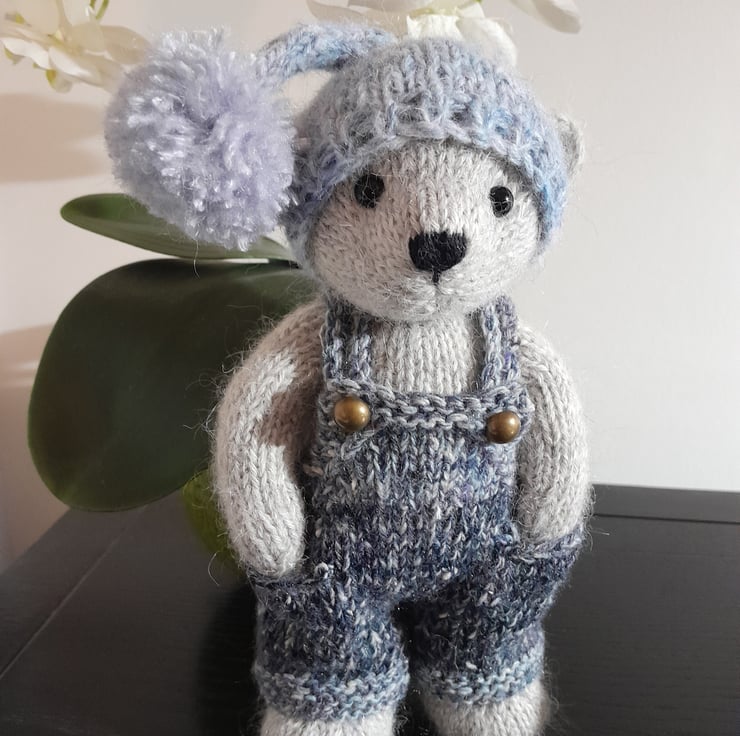 He wears denim dungarees and a cute little pompom hat which can be removed.