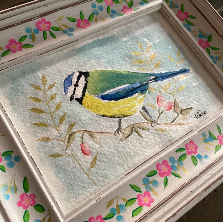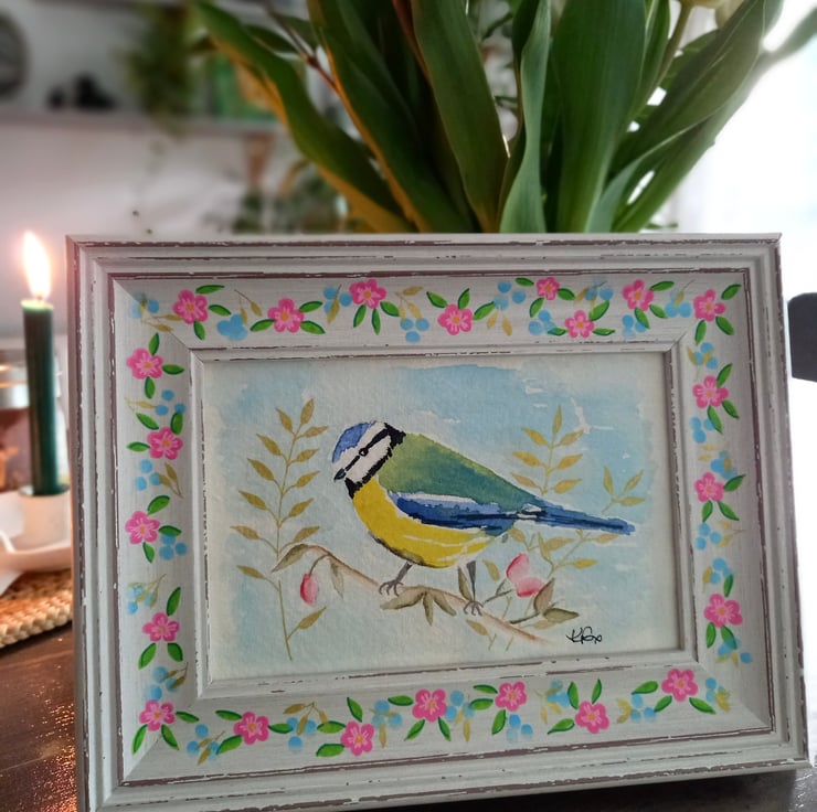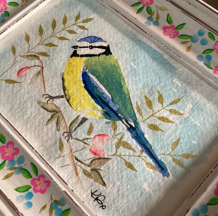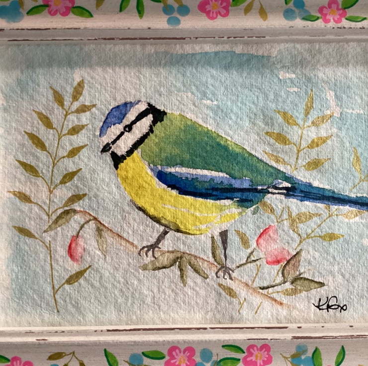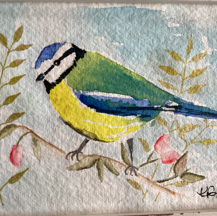 This is a charming hand painted watercolour of a blue tit perched on a branch with leaves and blossoms - thoughts of Spring .