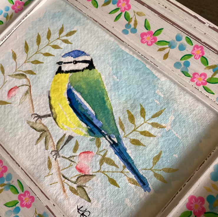 The blue tit is painted in vibrant blue, yellow and green, giving it a lifelike yet whimsical feel.