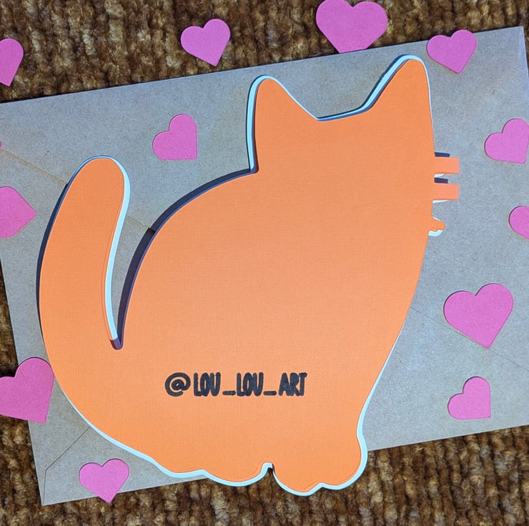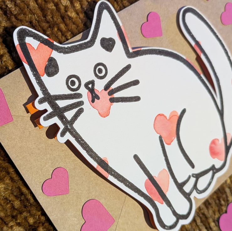 This cat is painted with stylised love hearts in a orange-pink colour. with an orange card inner. It also comes with cardboard love-heart confetti as pictured!
