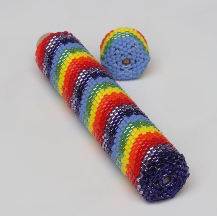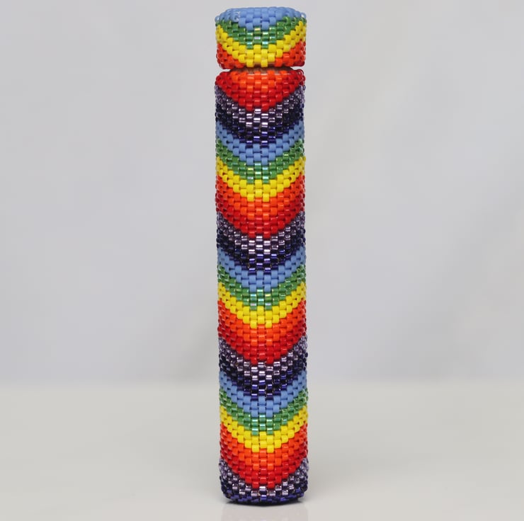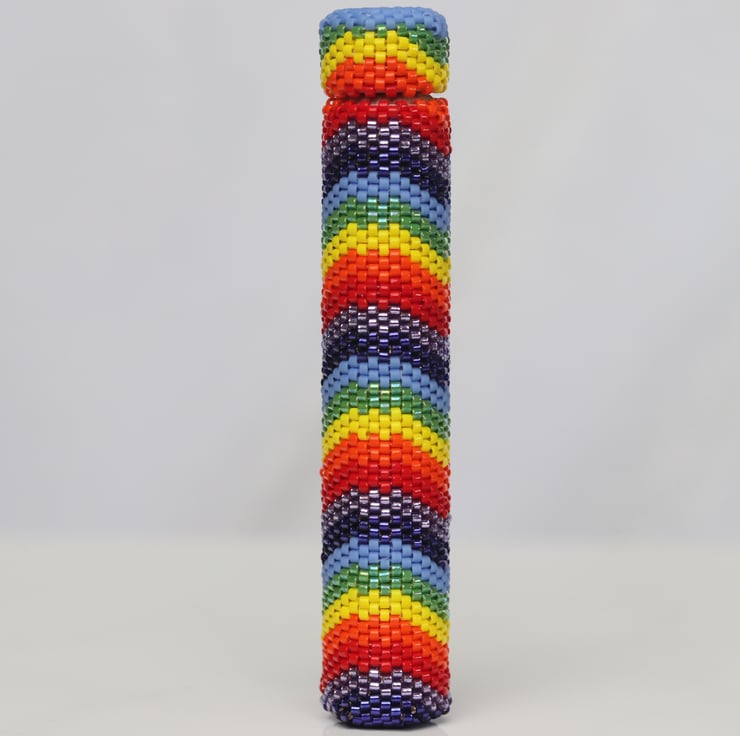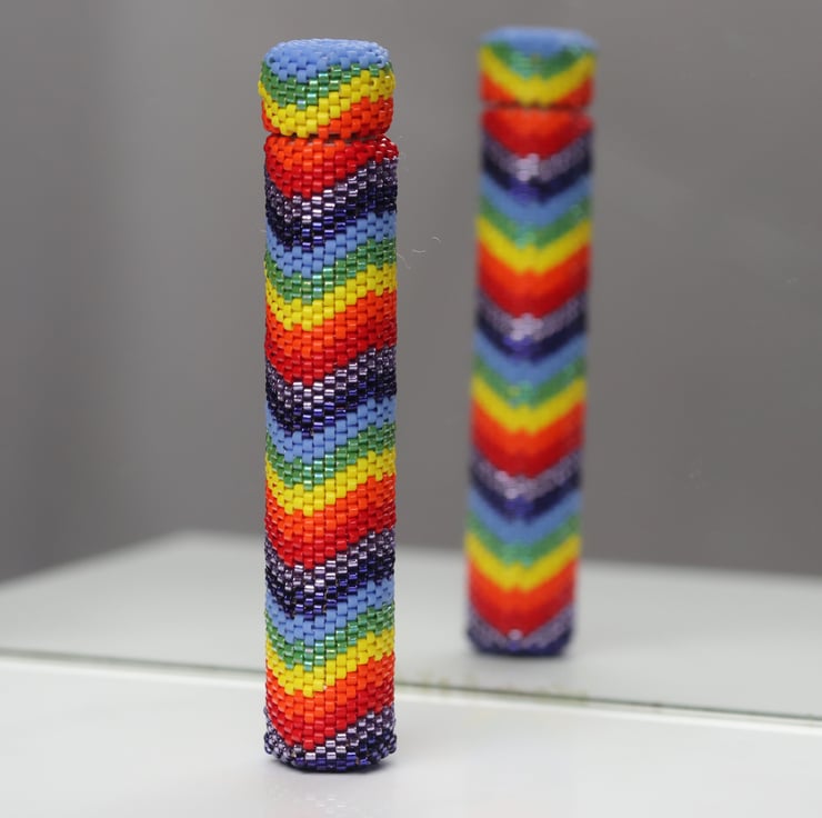 This extra-long needlecase makes a thoughtful gift for any hobbyist or friend who sews by hand. It makes the perfect storage solution if your sewing needle collection includes longer tapestry or darning needles. I have taken a case which has been crafted from turned wood and decorated it with beadwork; a peyote design in vibrant rainbow colours, made from size 11 glass Delica beads.