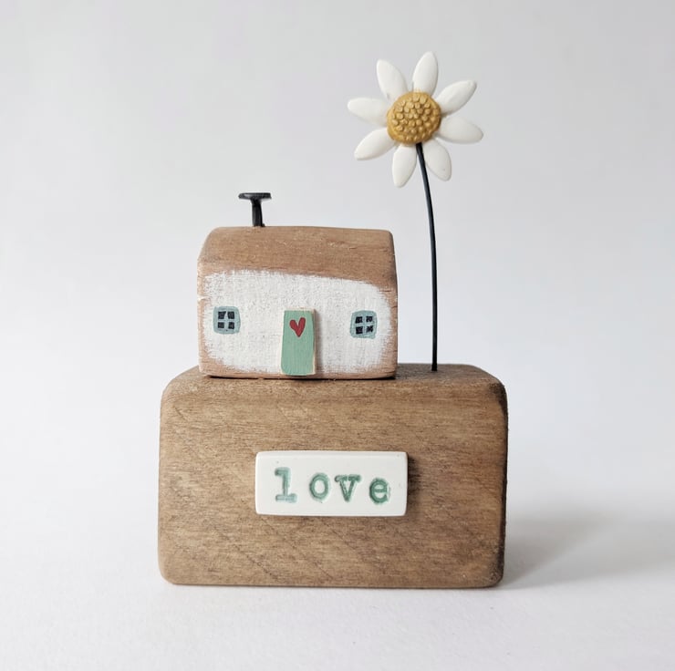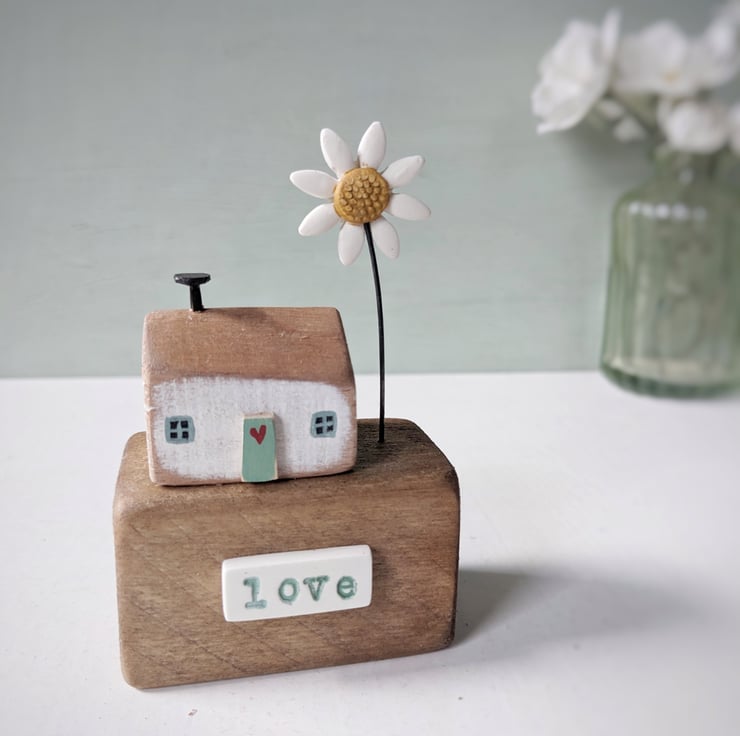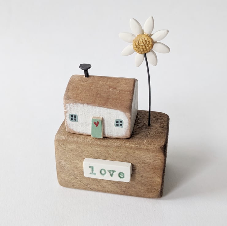 This is one of my little houses, sitting on a lovely reclaimed wooden block. A jolly flower finishes the scene.