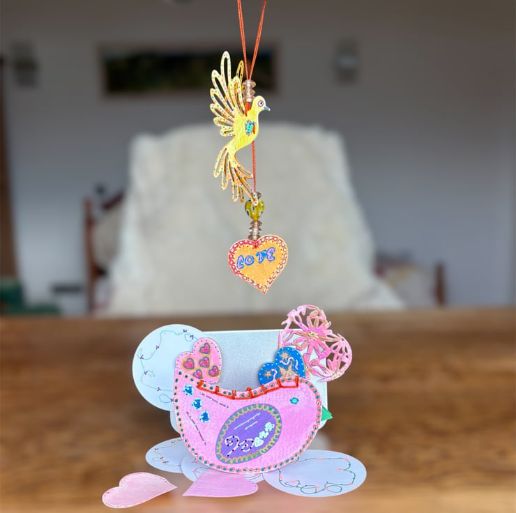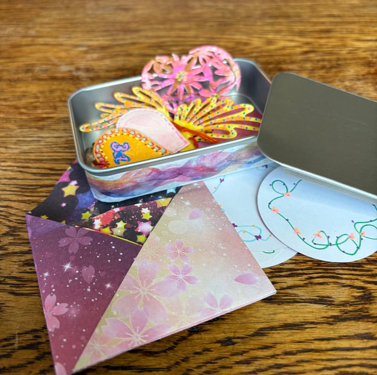 A tin of hand painted lovely things with a hearts and birds theme. The tin doubles as a desk or shelf display stand for the magnets, notes and ephemera