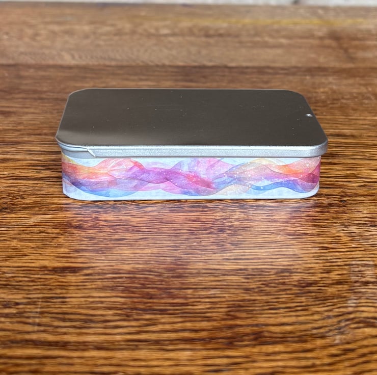 The tin has a sliding lid, is magnetic and sits nicely on its long edge making a display stand for the magnets.