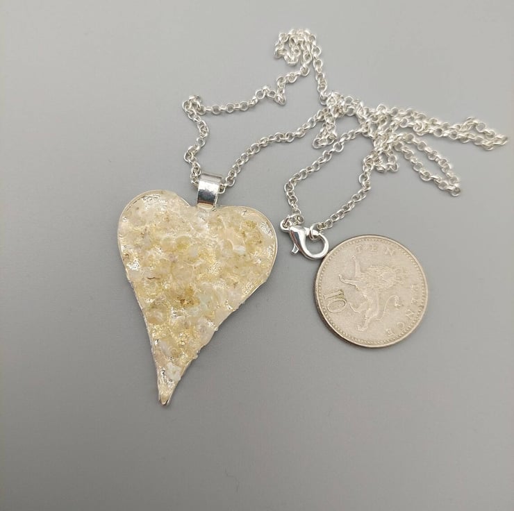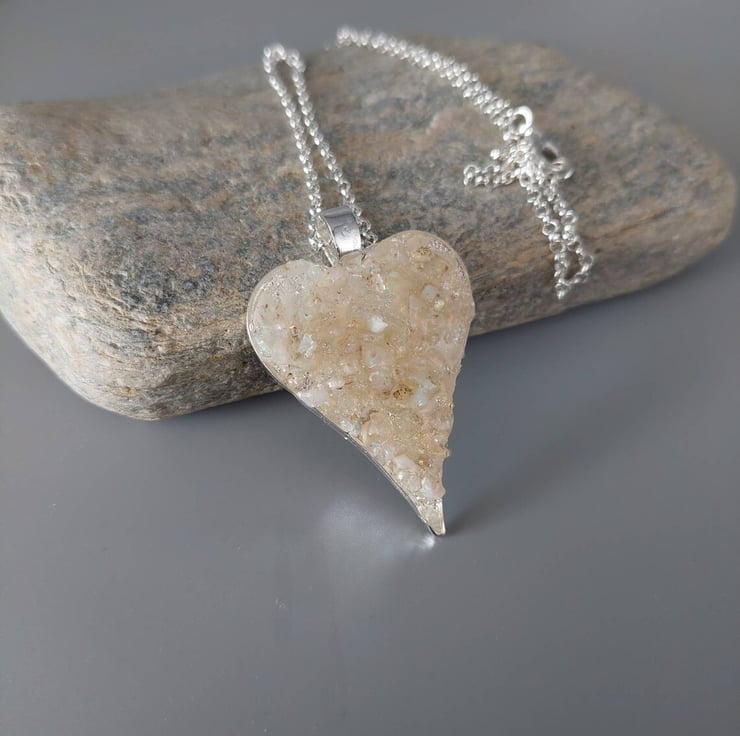 This necklace has been made by using some Ethiopian Opal gemstone chips set into a heart bezel pendant with some clear epoxy resin. The opal gemstone chips have been placed into the pendant organically, this is so you can see and feel the texture like you would a geode, which is where I got this inspiration from.
