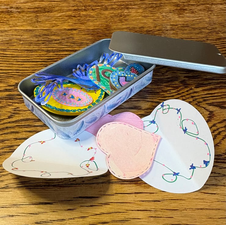 A mini tin of hand painted lovely things with a hearts and birds theme. The tin doubles as a desk or shelf display stand for the magnets, notes and ephemera