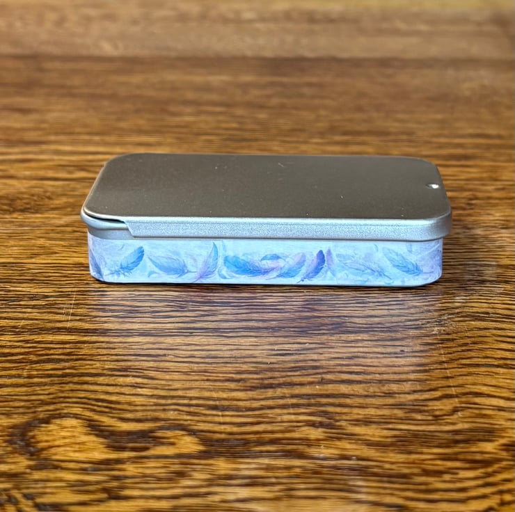 The tin has a sliding lid, is magnetic and sits nicely on its long edge making a display stand for the magnets.