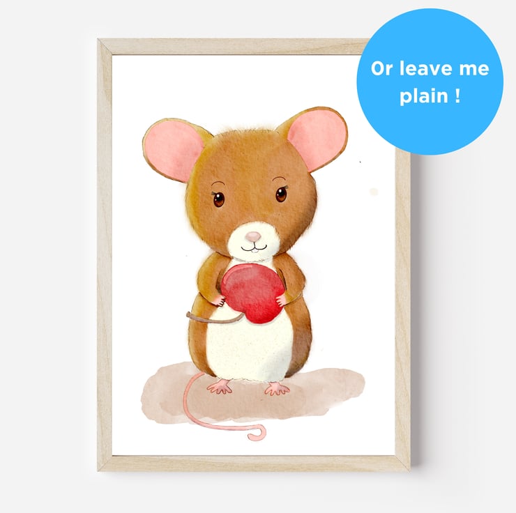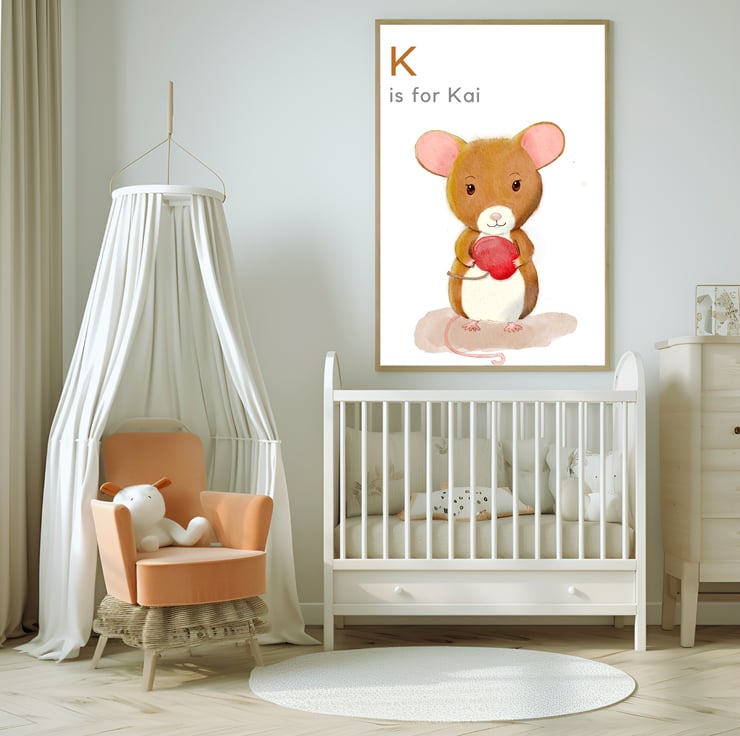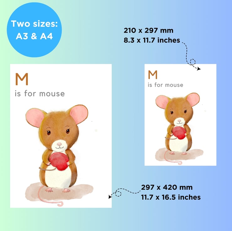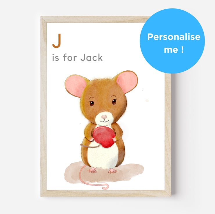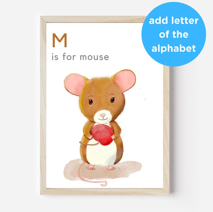 Your print is personalised. Alternatively, the words 'M is for mouse' can be added instead, if you prefer. Can also be supplied without any wording.