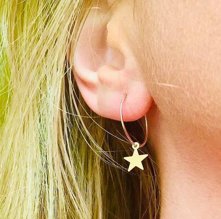 15mm 14k gold filled hoop earrings with 10mm 14k gold filled star charms. Very pretty. Hoops are approx 1.25mm in thickness. Light to wear, also available in sterling silver in our shop. Free gift box tied with ribbon,