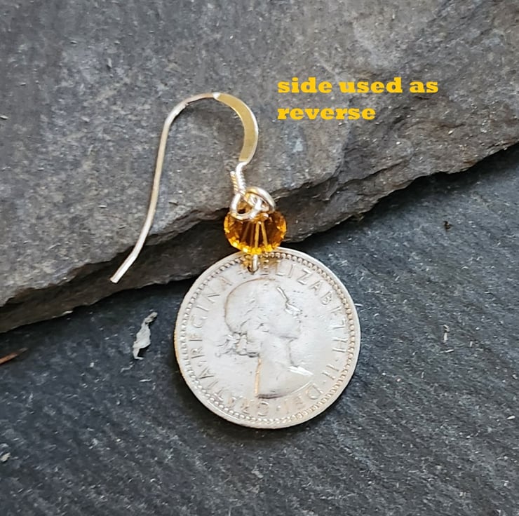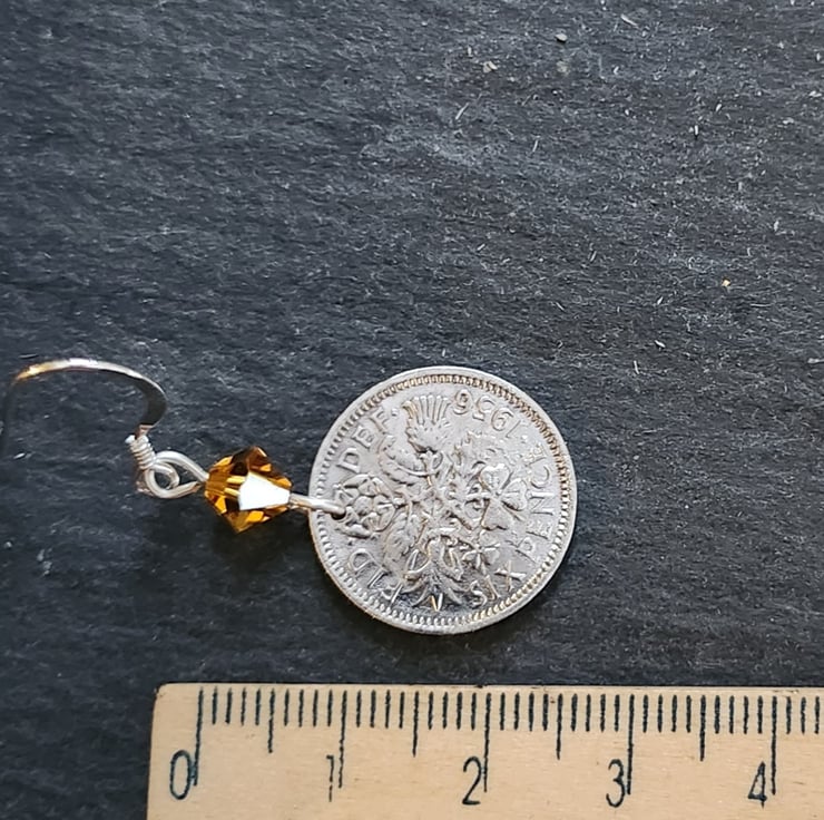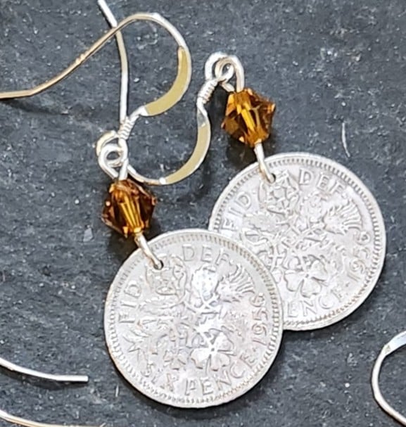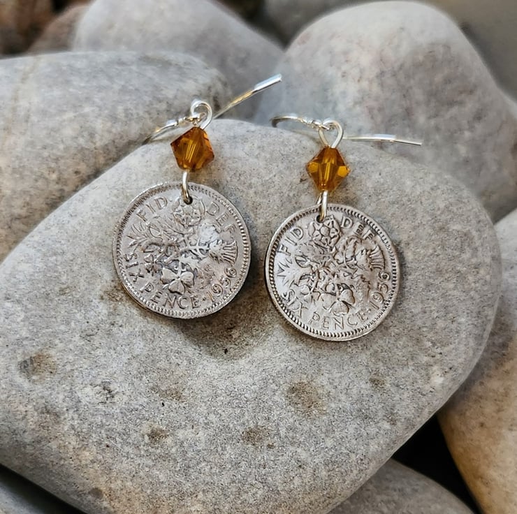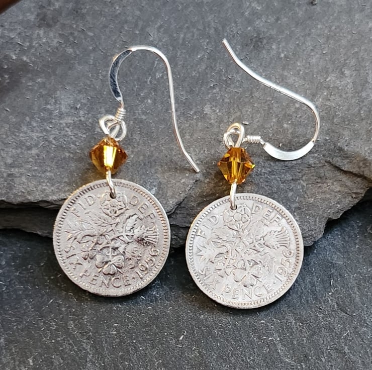 Pre-decimal sixpence (6d) coins from 1956, ideal for a 70th birthday present in 2026. The ear wires are sterling silver, however, the sixpence by this time had no silver content whatsoever, they are cupronickel. Yellow coloured preciosa crystals. Approximately 3cm drop.