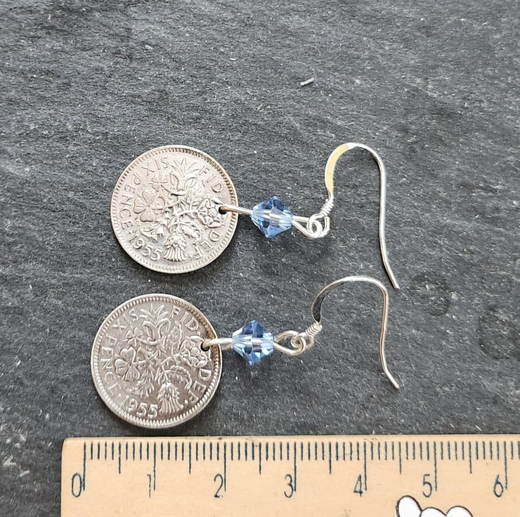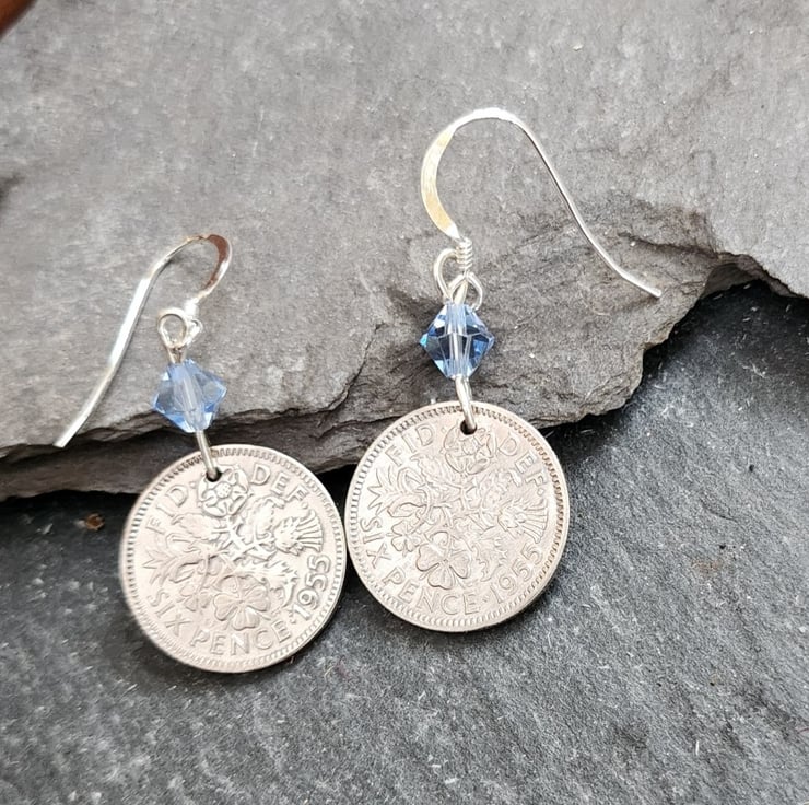 Pre-decimal sixpence (6d) coins from 1955, ideal for a 70th birthday present this year. The ear wires are sterling silver, however, the sixpence by this time had no silver content whatsoever, they are cupronickel. Pale blue coloured preciosa crystals. Approximately 3cm drop.