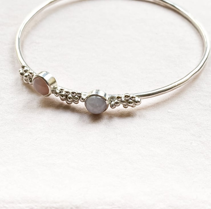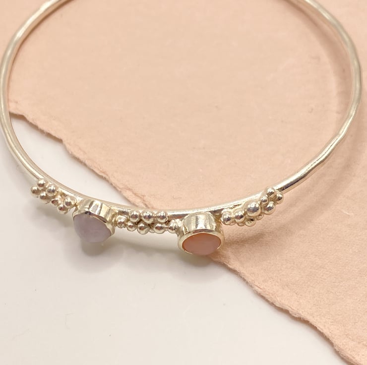 One of a kind sterling silver bangle with a pink Opal and a lavender Jadeite. Handmade using traditional metal smithing techniques.