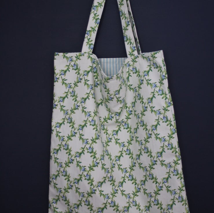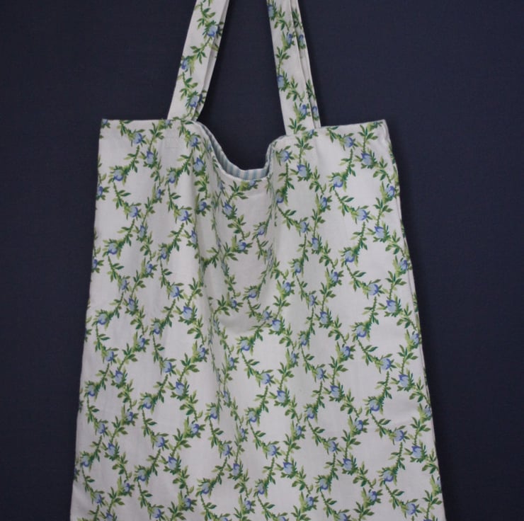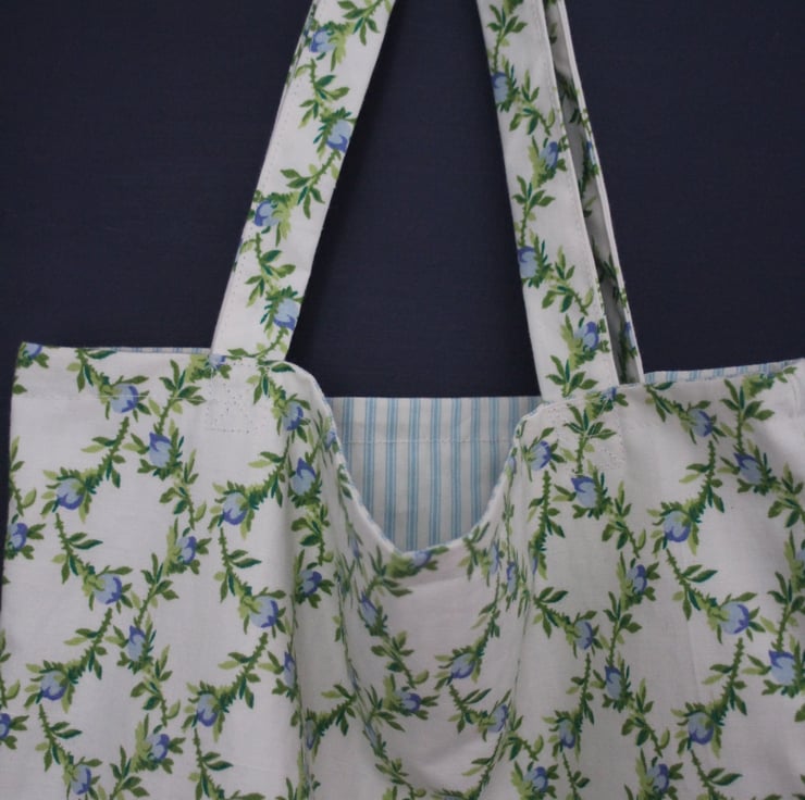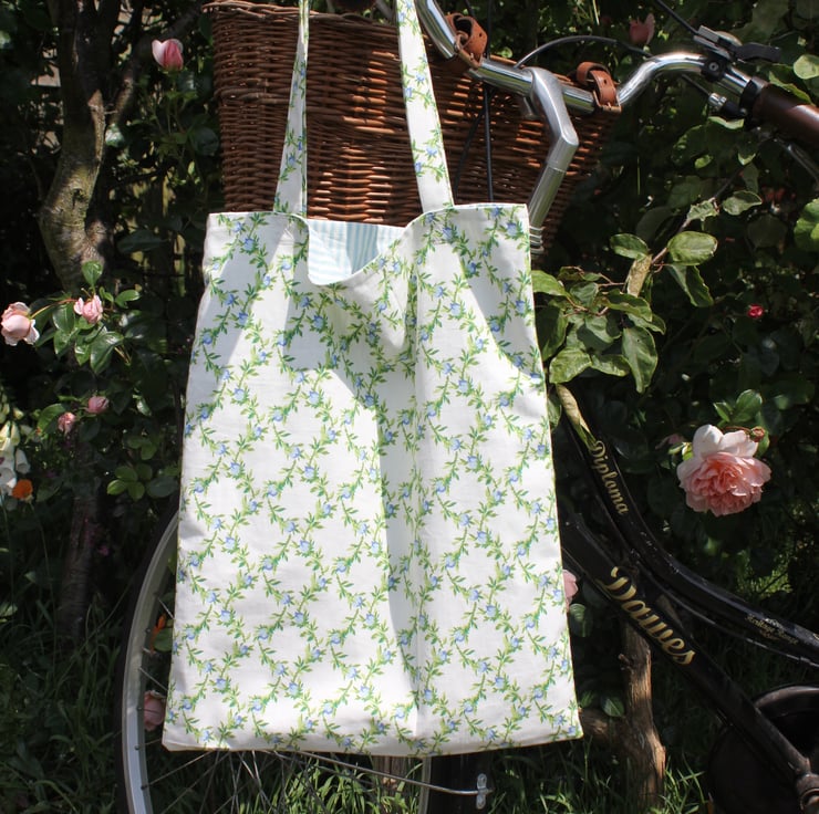 Perfect for Spring, this gorgeous floral shopping bag is made from a remnant of vintage Sanderson fabric featuring a rosebud trellis pattern in shades of blue and green against a white background. It is lined with a co-ordinating pale blue ticking stripe cotton fabric.