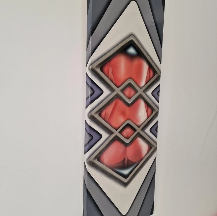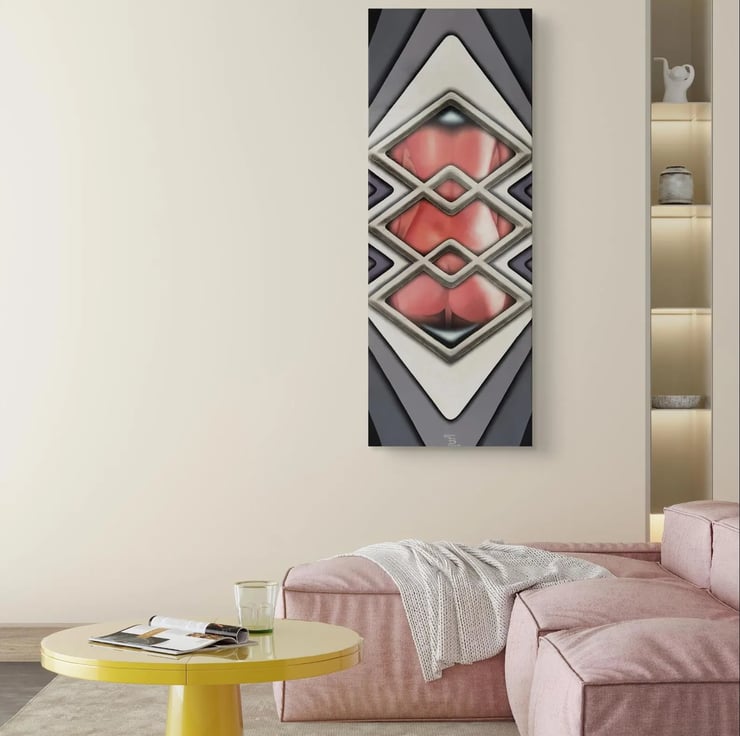 This decorative unique style painting makes any bedroom or living room outstanding. It intends to bring eye catching warm atmosphere wrapped into a very modern design. Eases the mind and it is very relaxing by taking the watcher to a journey to admire the feminine beauty. Features silver framed rhomb windows around the female body.