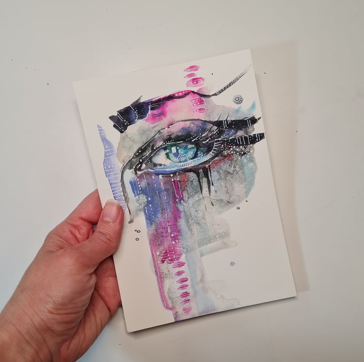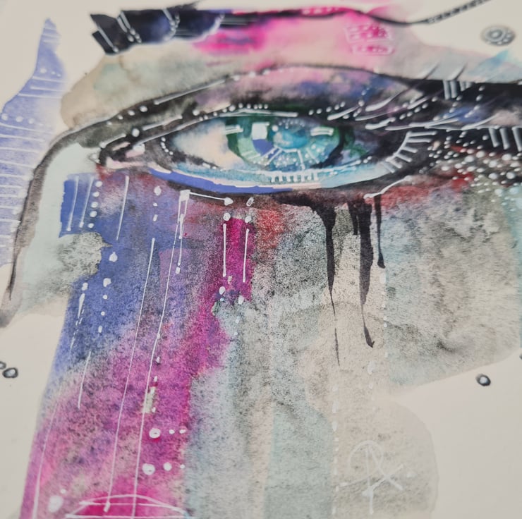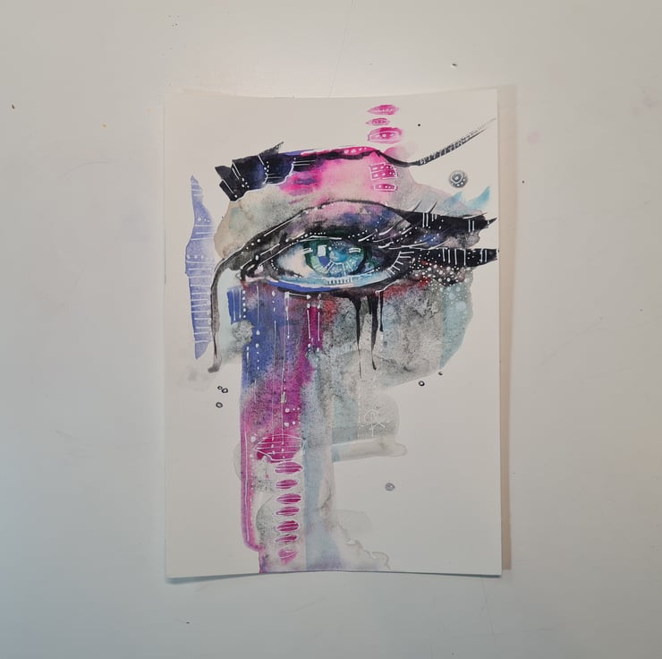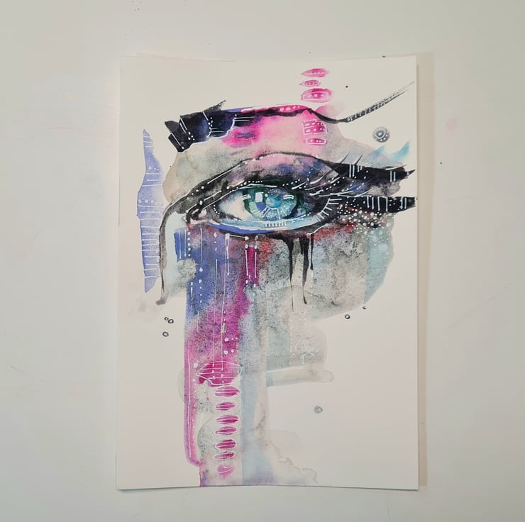 This is a small unique original watercolour painting of a smokey, yet dreamy, beautiful eye. It looks like a jewel eye, with powerful make up, ready to party, with white acrylic ink detail line work. A perfect gift for a young trendy person.