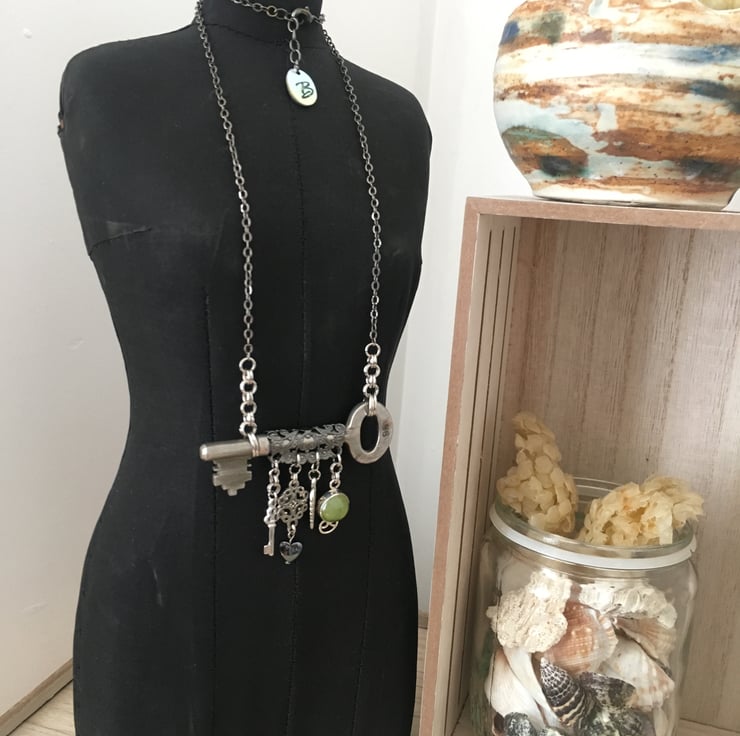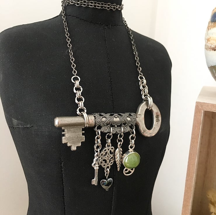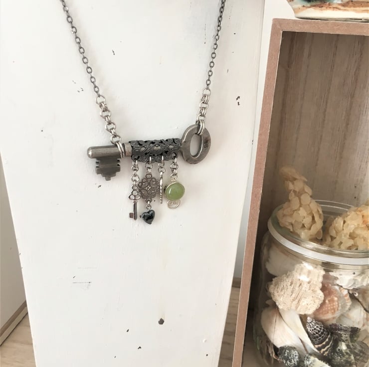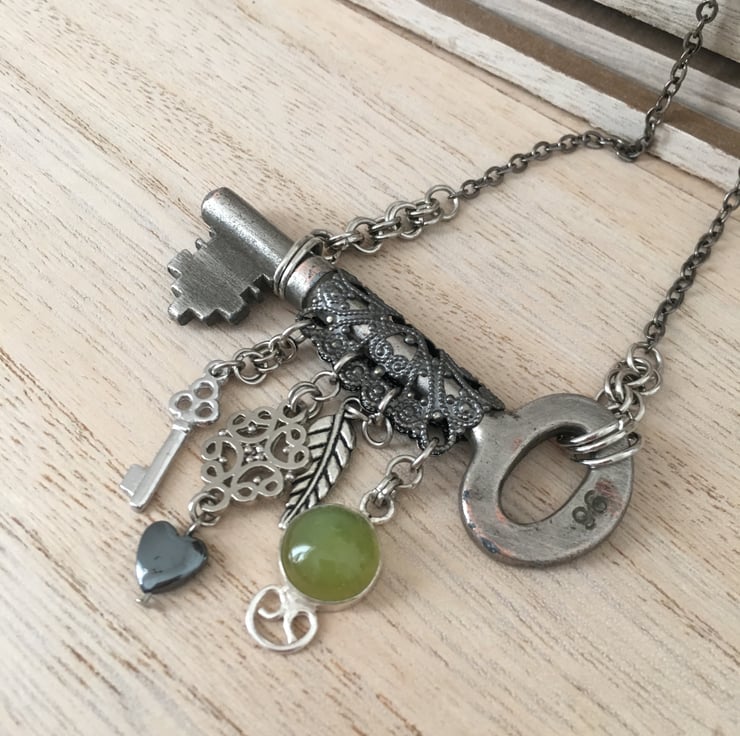 Up-cycled vintage key with a heart, a mini vintage key charms and a semi precious olive color stone agate pendant statement necklace - one off design