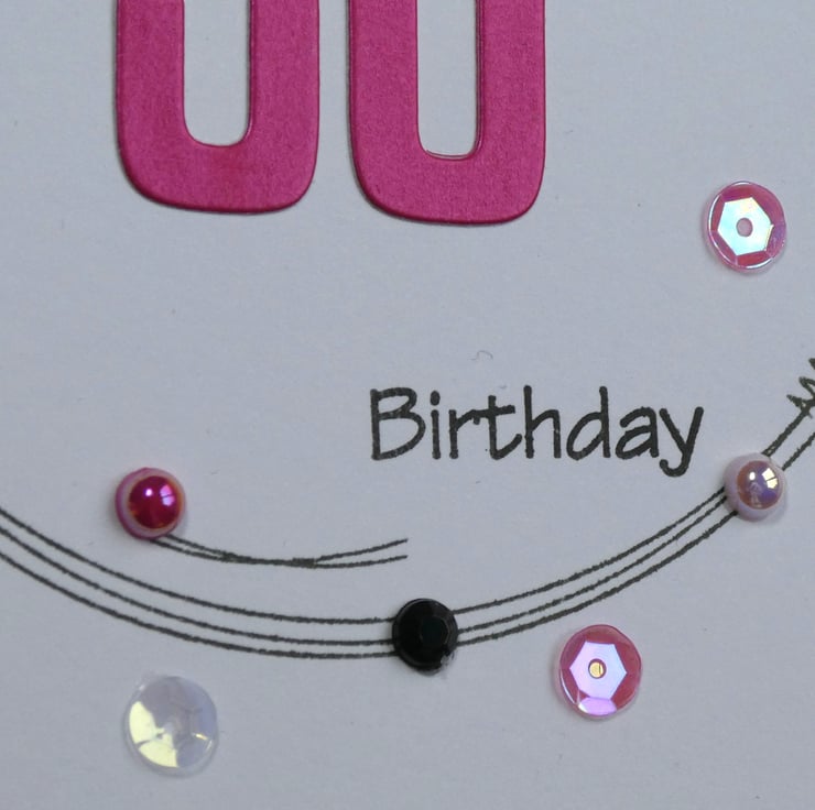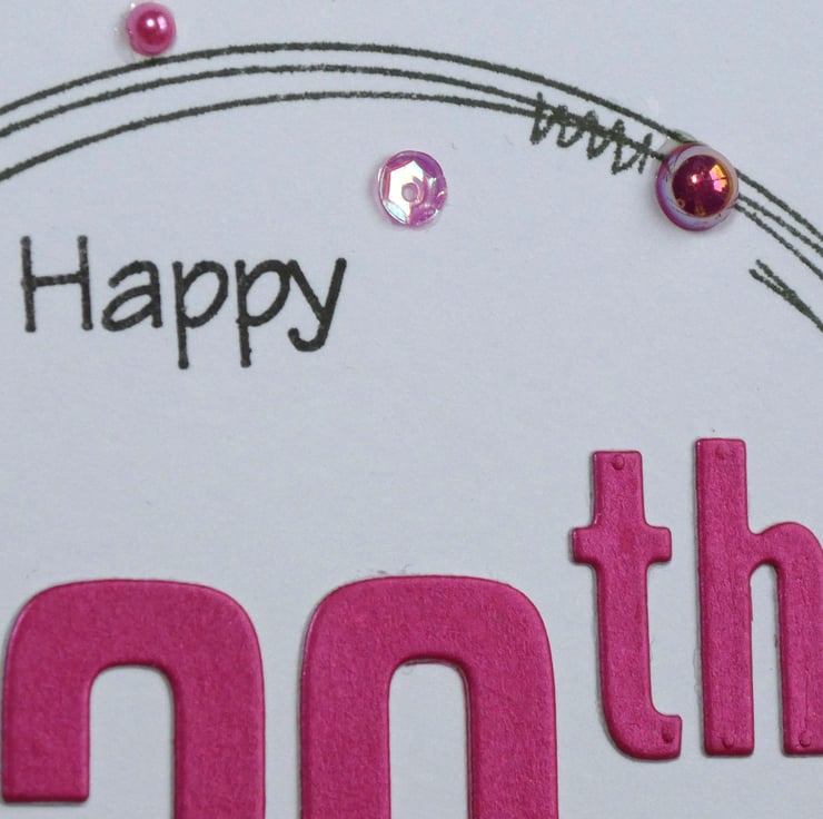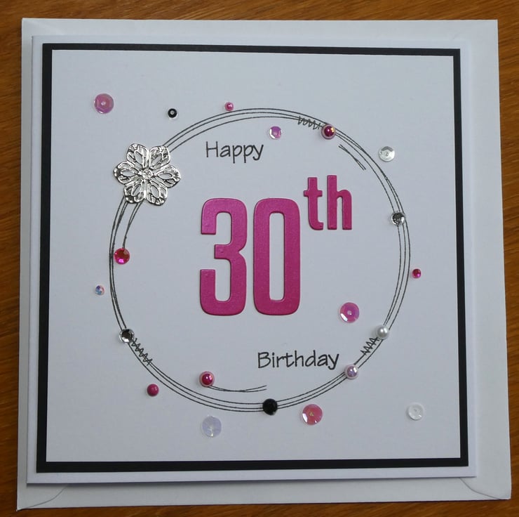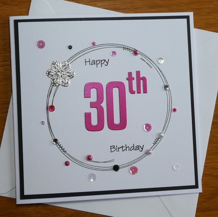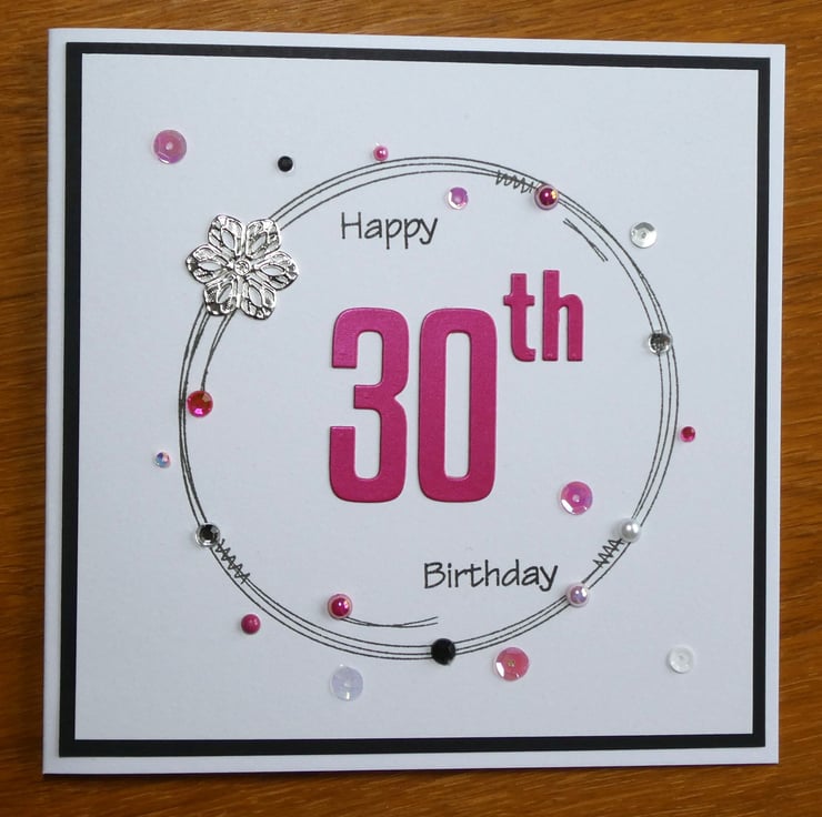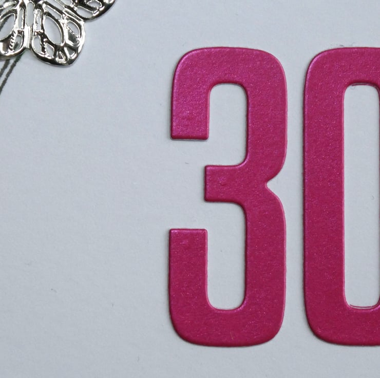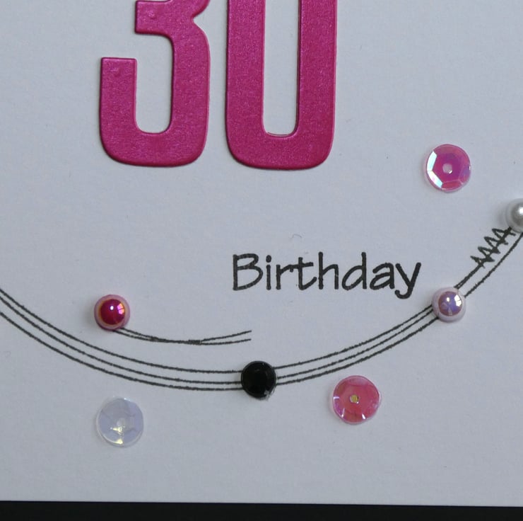The front of the card has the greeting Happy 30th Birthday in a mix of black archival ink and pearlescent fushia pink card.