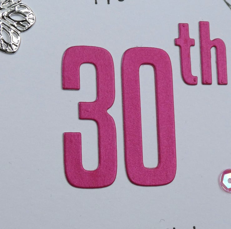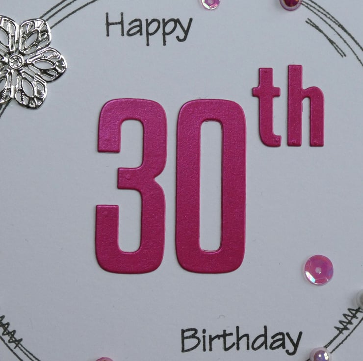 This special 30th birthday card has been hand stamped and decorated in shades of pink, white and silver.